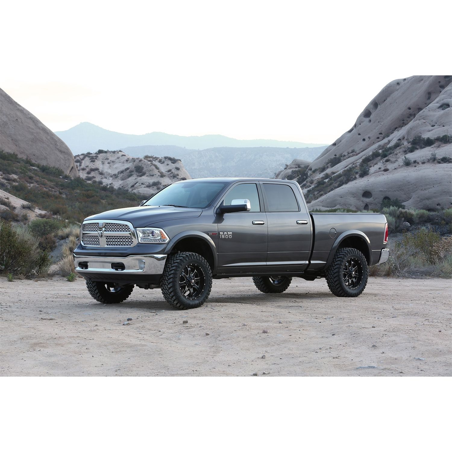 Our Dodge 1500 6 system features Fabtechs proven IFS technology with extended length steering knuckles for proper factory electronic stability control functionality. Heavy duty 1/4 thick steel lower control arm crossmembers provide superior ground clearance while the integrated front differential skid plate adds protection to the drivetrain. In the Basic system lift is accomplished via a steel coilover shock spacer system retaining the stock ride characteristics of the vehicle. Rear lift is accomplished with replacement performance coil springs along with new upper and lower link arms for the proper pinion angle without loss of ground clearance.