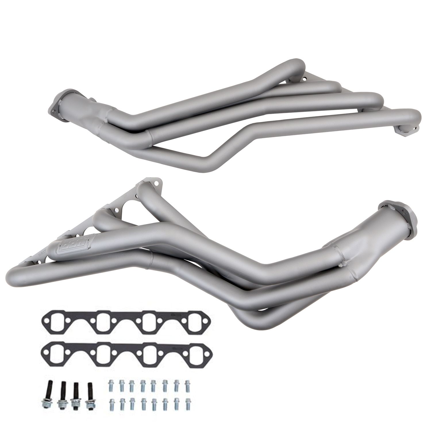 BBK Performance full length long tube exhaust headers offer unsurpassed quality and fitment using top quality materials and American craftsmanship. Every long tube exhaust header system is hand built with CNC mandrel bent tubing for unrestrictive exhaust flow and maximum performance, 3/8" laser cut flanges, patented scavenging collector design and gasket less ball and socket connectors for easy installation. Every exhaust header has been designed specifically for your application to get the most horsepower and torque out of the engine. BBK long tube exhaust headers outperform the competition in quality value and performance. All headers are a direct fit bolt on replacement when used with the correct matching mid-pipes which are available with high flow catalytic converters and in off road race versions. Our decades of exhaust design and experience make BBK Performance your number one choice for late model American car and truck performance exhaust.