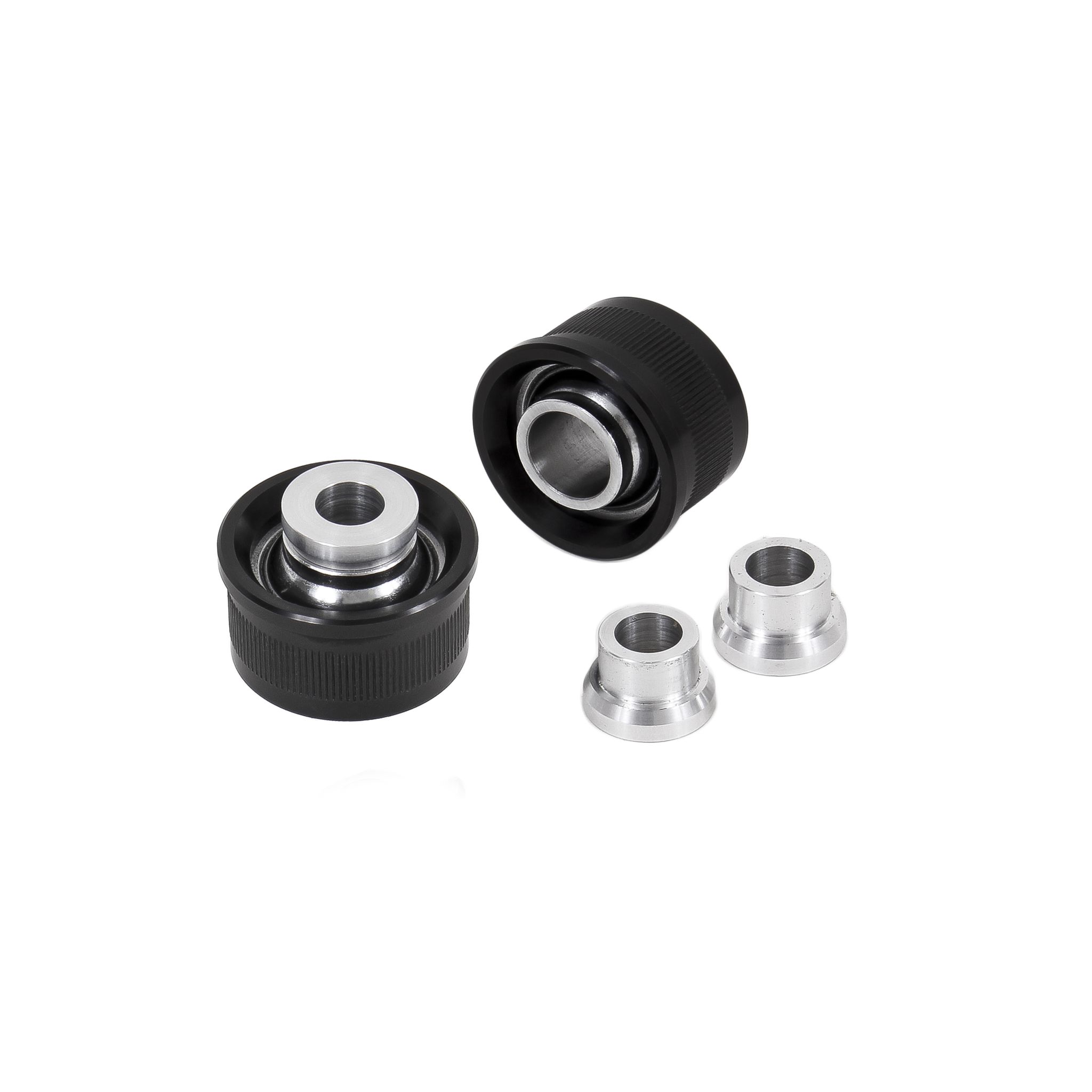 Minimize wheelhop and enhance the rear stability of your 2016 and newer Chevrolet Camaro by eliminating rear lower trailing arm bushing deflection with a set of Lower Trailing Arm Spherical Bearings from BMR Suspension. The stock rubber bushings are great for absorbing NVH, but do little for performance. The spherical bearings in BMR's rear Lower Trailing Arm Spherical Bearing Kit simply eliminate bushing deflection, transferring power instead of absorbing it. BMR Suspension's rear Lower Trailing Arm Spherical Bushings (BK066) drastically decreases lower trailing arm movement by eliminating deflection of the factory rubber bushings. BMR uses heavy-duty 3/4-inch spherical bearings in machined bearing cups to replace the factory rubber bushings. The cup and bearing press into the rear spindle. CNC-machined billet aluminum spacers complete the assembly. This allows for a perfect fit and increased performance for any driving style.
