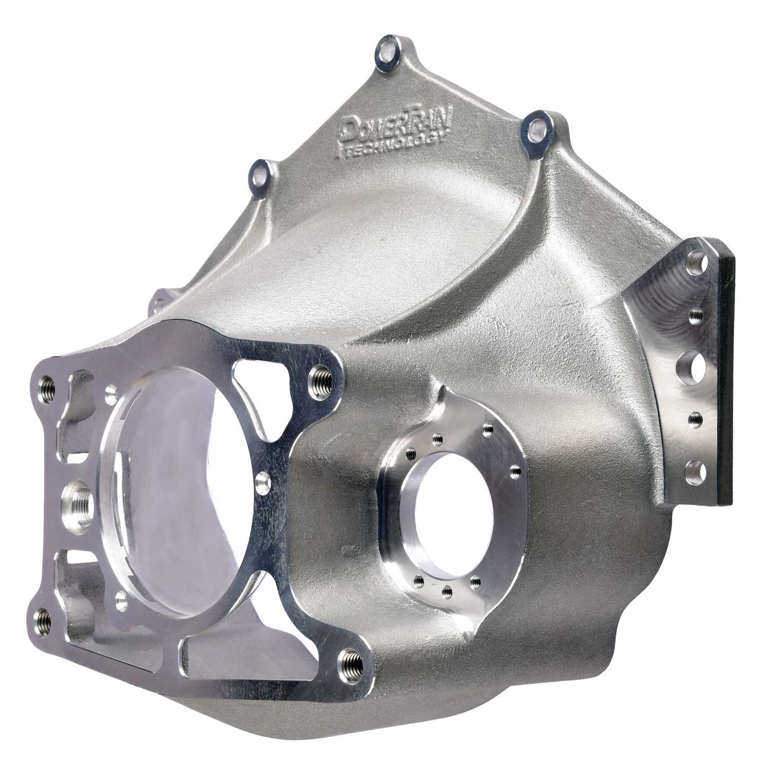 PTT's reverse starter mount bellhousing has set a new standard for lightness. The aluminum bellhousing weighs a mere 9 pounds! This bellhousing is intended to be used with lightweight, button-style flywheels and a starter ring gear mounted on top of the clutch. There are a number of advantages to using a reverse mount bellhousing. The starter is mounted away from the heat of the headers. The small diameter flywheel and clutch allow the drivetrain to be mounted lower in the chassis. The smaller overall physical size of the bellhousing is more easily packaged in a stock car. Relocating the starter lowers the vehicle's polar moment of inertia, resulting in better handling and faster turn-in response.