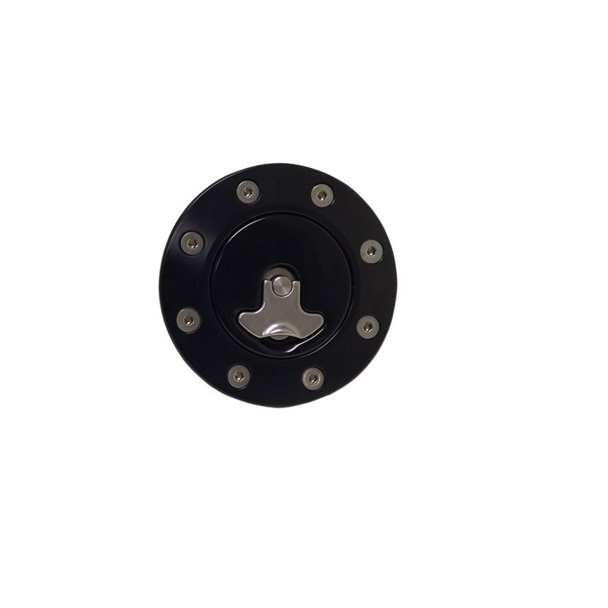 Billet aluminum gas cap, universal fit, locking, anodized Black. Includes cap, 2 keys, housing, neck, and gaskets.