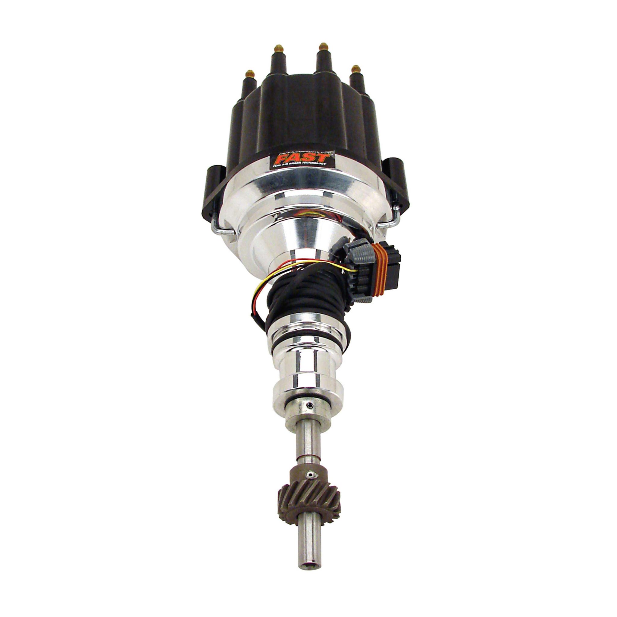 FAST Dual-Sync Distributors are an easy, drop-in, plug-and-play solution for fully sequential high performance V8 EFI engine applications. Featuring reluctors and pick-ups that have been properly aligned right out of the box, they eliminate the need to set crankshaft reference angles or rotor phasing manually before installation. FAST Dual-Sync Distributors also feature housings that are CNC-machined from high-quality 6061-T6 billet aluminum. Using high output magnetic pick-ups to generate high capacity, noise resistant, discrete switching signals to the FAST XFI 2.0 and EZ-EFI 2.0 Fuel + IgnitionECUs, they deliver extremely precise ignition timing and extra long life.