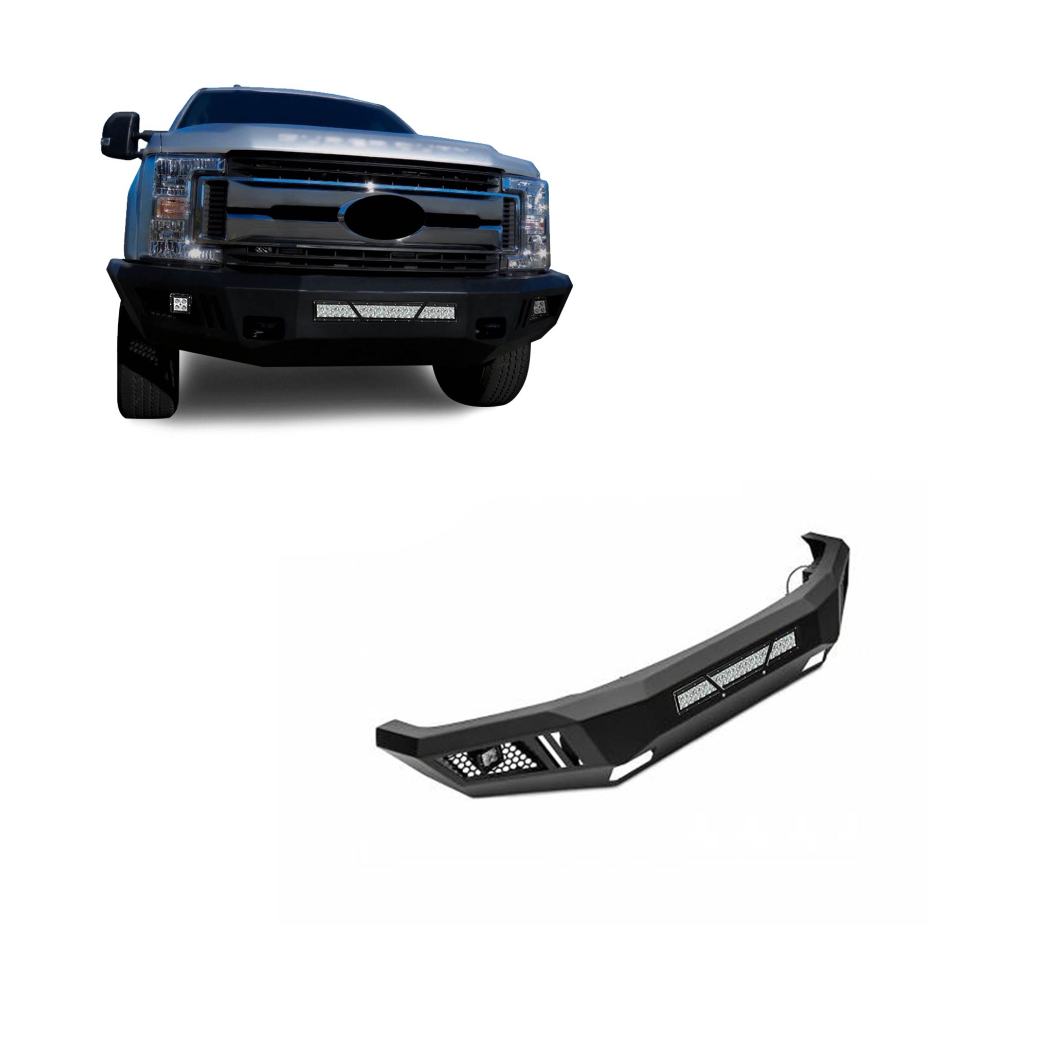 Black Horse Off Road Armour Heavy Duty Front Bumper Kit Matte Black Steel Armour I Front Bumper Includes 1 20in LED Light Bar, 2 sets of 4in cube lights Incl. Sensors Relocation Kit Material Thickness Is 3mm , Bracket Thickness is 6mm