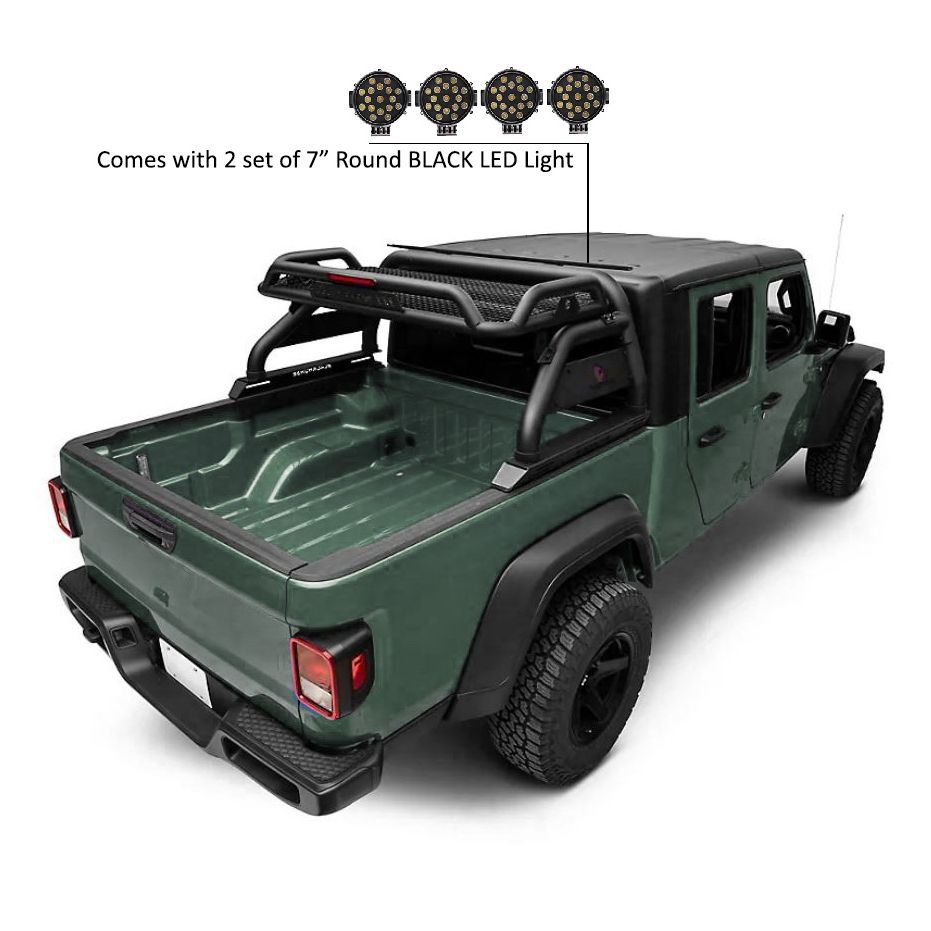 Black Horse Off Road Atlas Roll Bar Kit Black Steel Box 2 contains: 53lbs- 57x32x8 Incl. 2 pairs of 7.0"Dia. LED Lights w/ Black Trim Rings w/ Wiring Harness and Switch