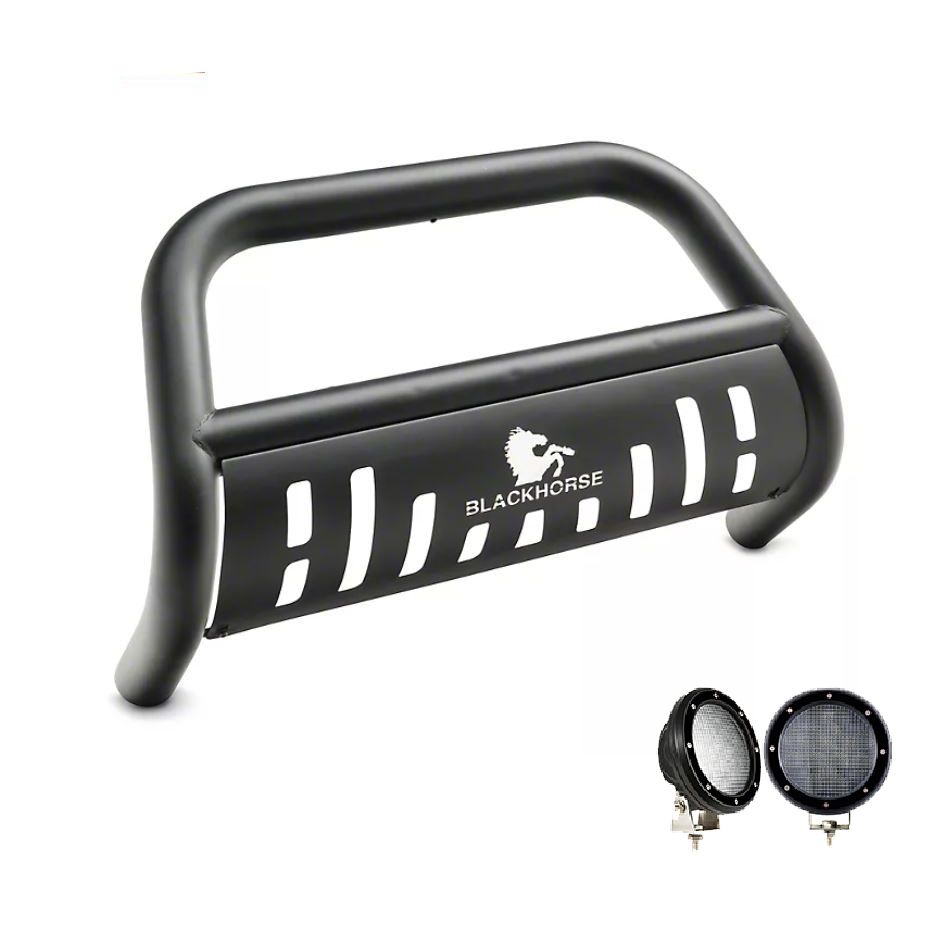 Black Horse Off Road Bull Bar Kit Black Steel Skid Plate Pair of 5.3" Dia. LED Flood Lights w/ Black Trim Rings Wiring Harness and Switch It May Interfere with Vehicles equipped with Emergency Braking Systems, Adaptive Cruise Control and Parking Sensors