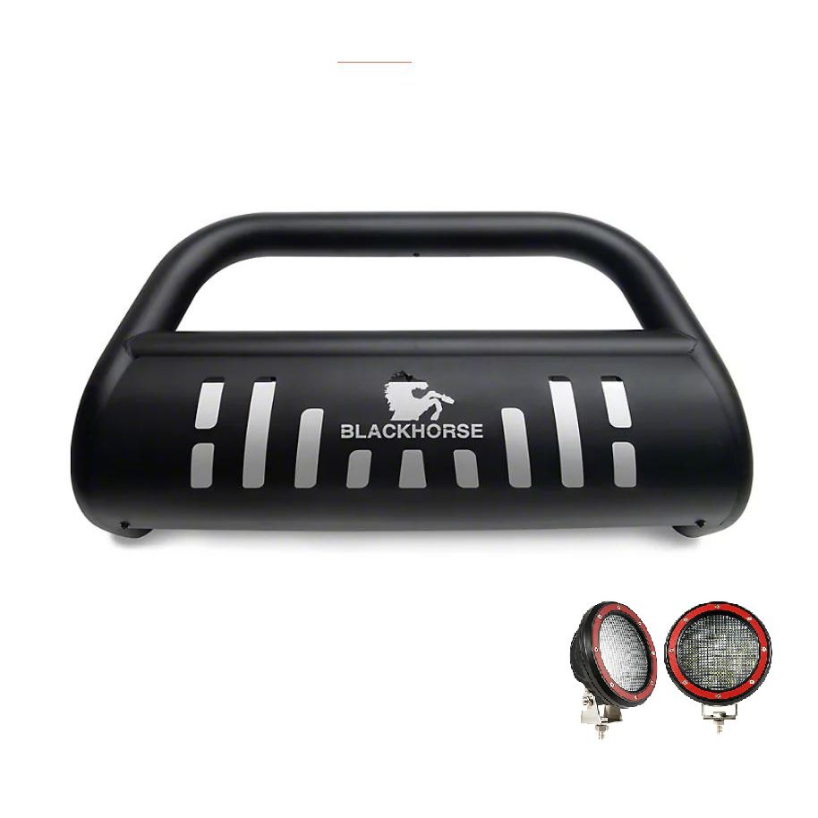 Black Horse Off Road Bull Bar Kit Black Steel Skid Plate Pair of 5.3" Dia. LED Flood Lights w/ Red Trim Rings Wiring Harness and Switch It May Interfere with Vehicles equipped with Emergency Braking Systems, Adaptive Cruise Control and Parking Sensors