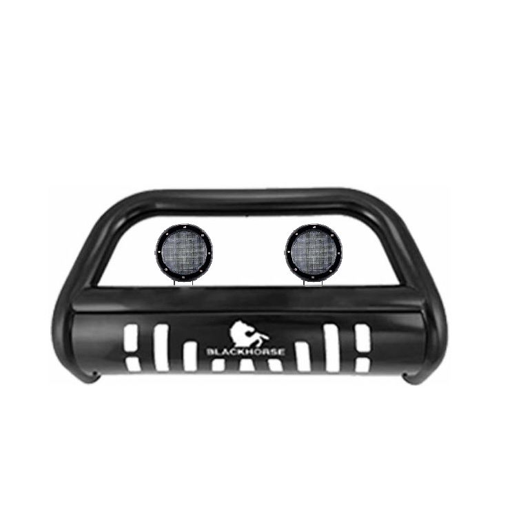 Black Horse Off Road Bull Bar Kit Black Steel Skid Plate Pair of 5.3" Dia. LED Flood Lights w/ Black Trim Rings Wiring Harness and Switch It May Interfere with Vehicles equipped with Emergency Braking Systems, Adaptive Cruise Control and Parking Sensors
