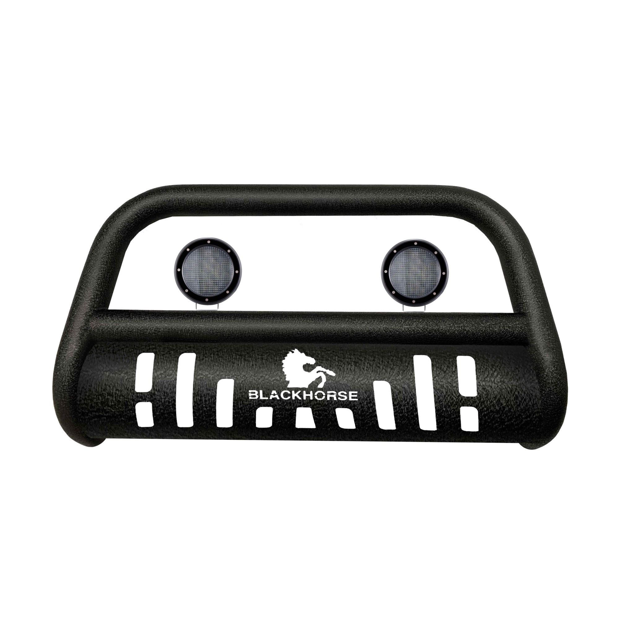 Black Horse Off Road Bull Bar-T Kit Textured Black Steel Pair of 5.3" Dia. LED Flood Lights w/ Black Trim Rings Wiring Harness and Switch