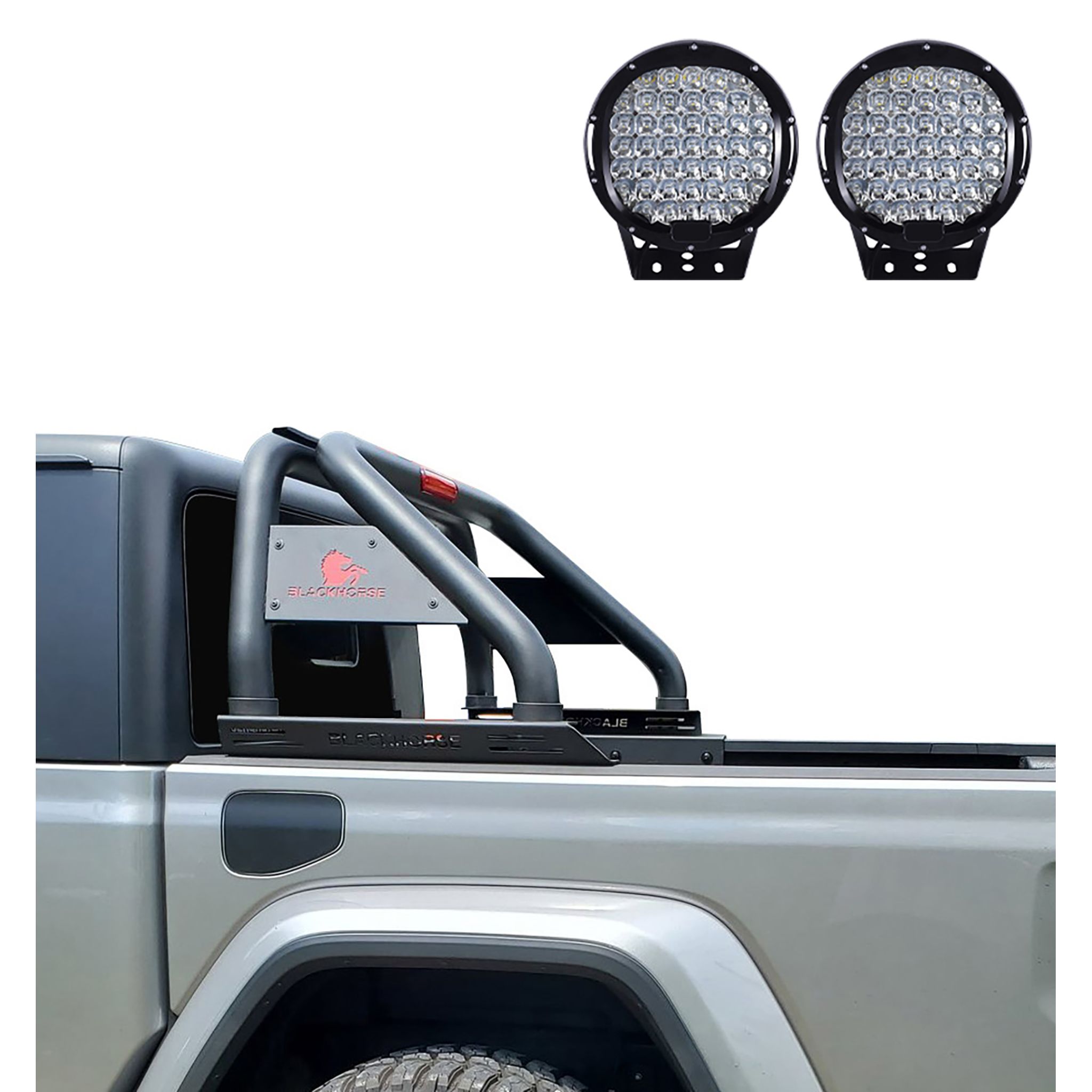 Black Horse Off Road Classic Roll Bar Kit Black Steel W/ Set of 9" Black Round LED Light Raised Base to Accommodate Tonneau Cover