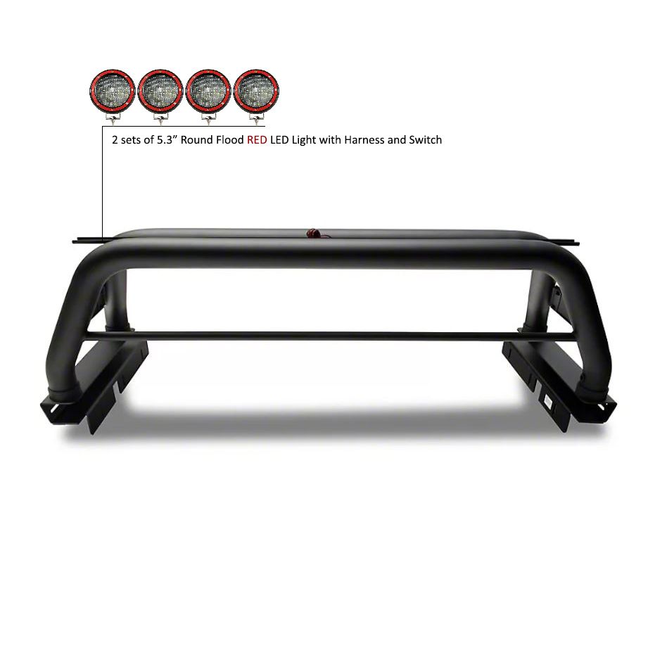Black Horse Off Road Classic Roll Bar Kit Black Steel 2 sets of 5.3" Dia. Black LED Flood Lights w/ Harness and Switch Raised Base to Accommodate Tonneau Cover