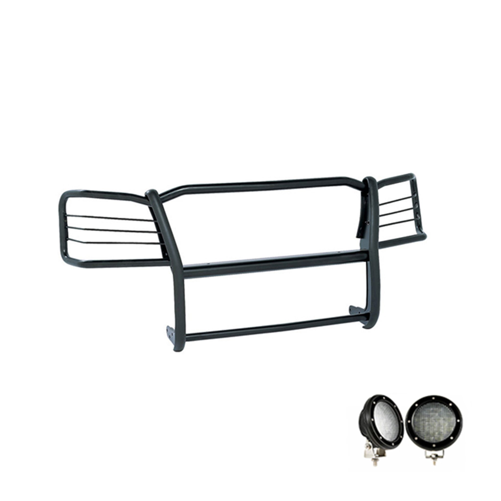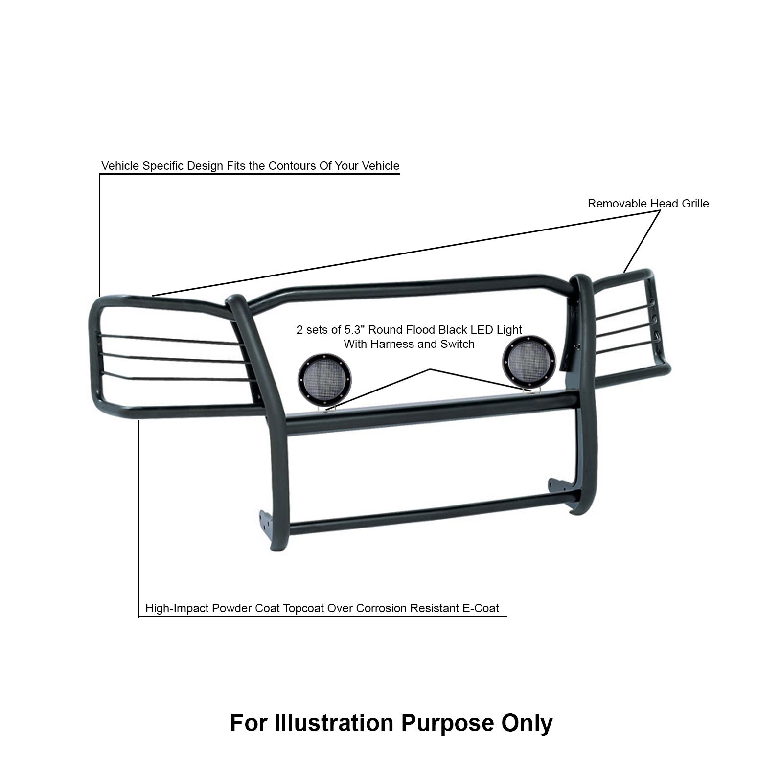 Black Horse Off Road Grille Guard Kit Black Steel Modular Pair of 5.3" Dia. LED Flood Lights w/ Black Trim Rings Wiring Harness and Switch