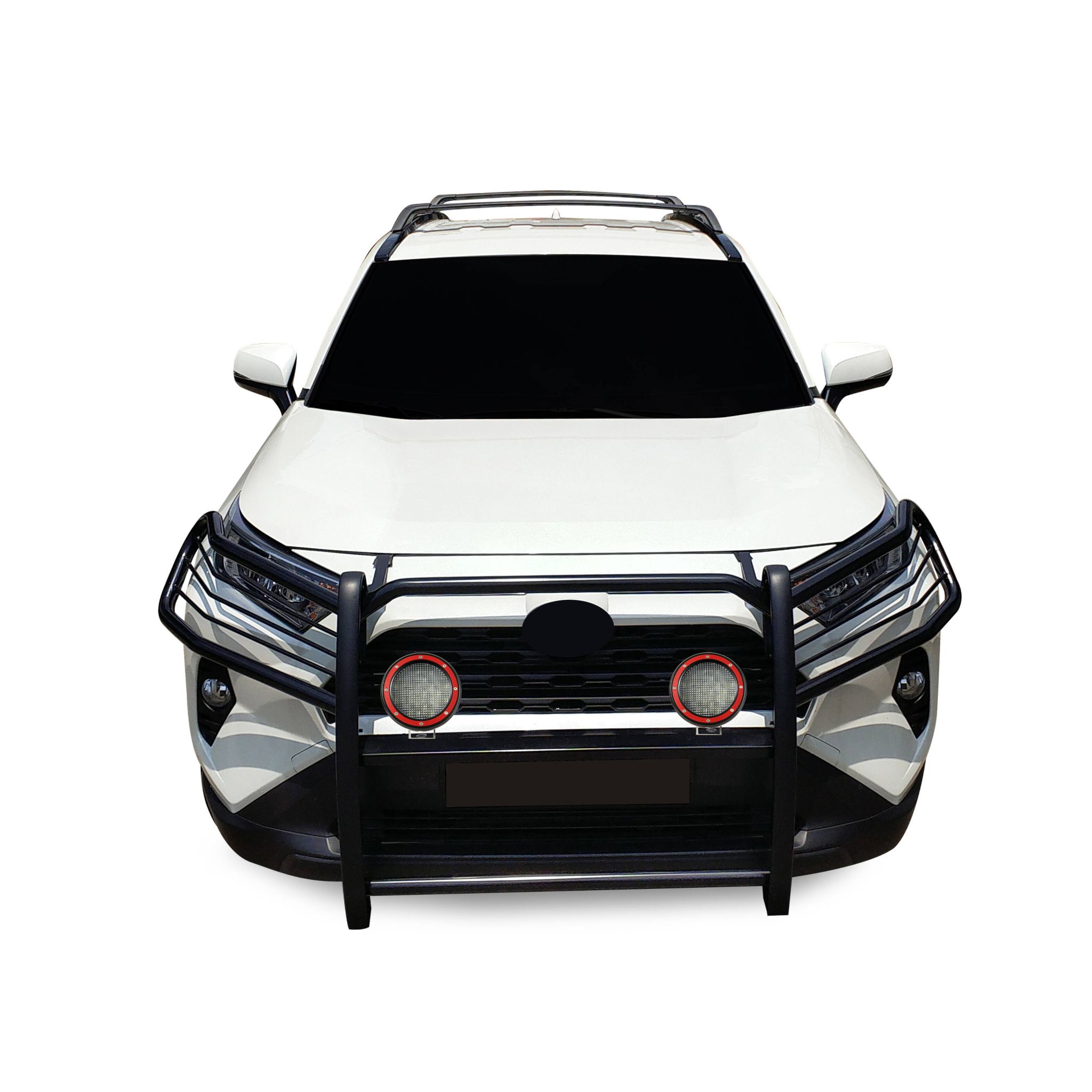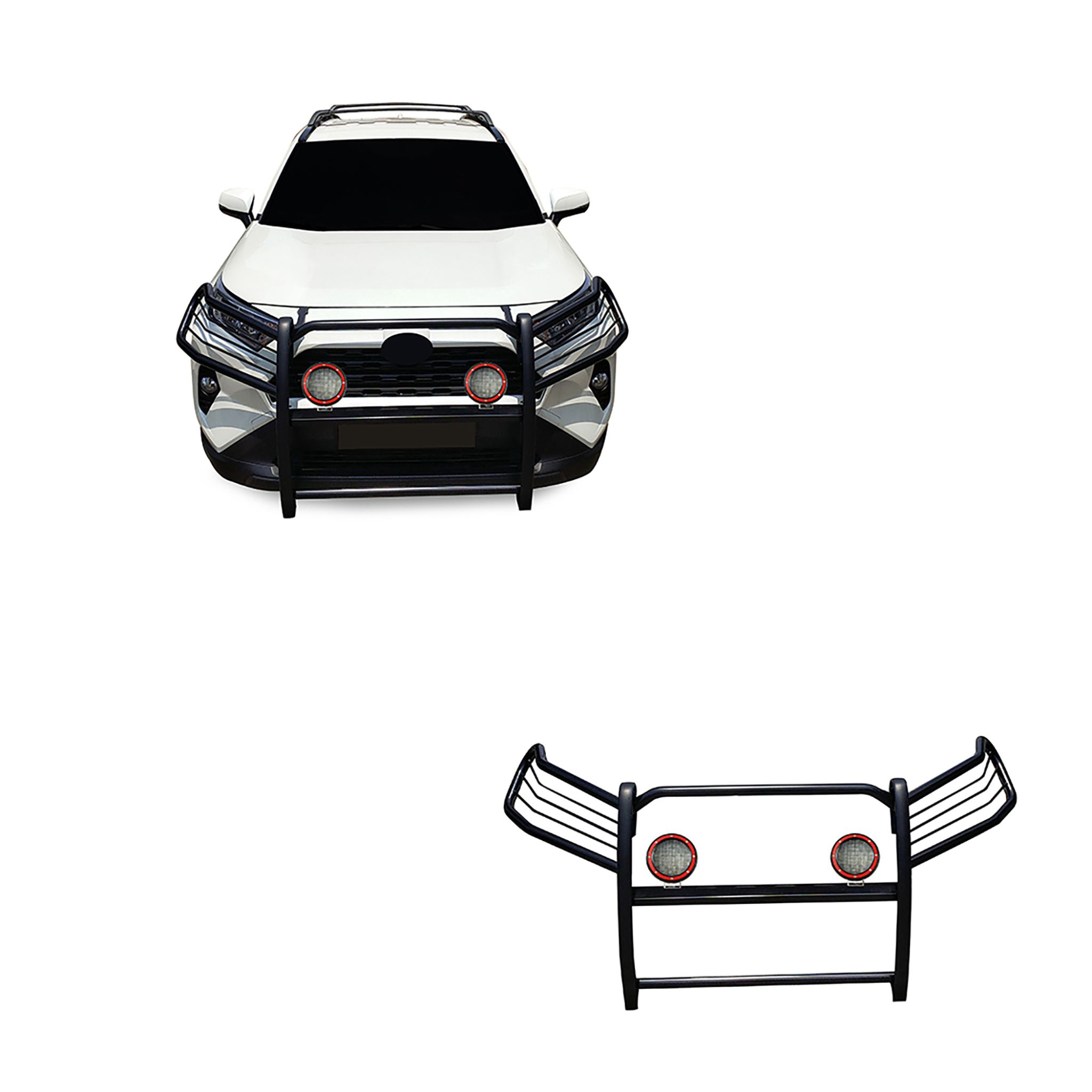 Black Horse Off Road Grille Guard Kit Black Steel Modular Pair of 5.3" Dia. LED Flood Lights w/ Red Trim Rings Wiring Harness and Switch It May Interfere with Vehicles equipped with Emergency Braking Systems, Adaptive Cruise Control and Parking Sensors
