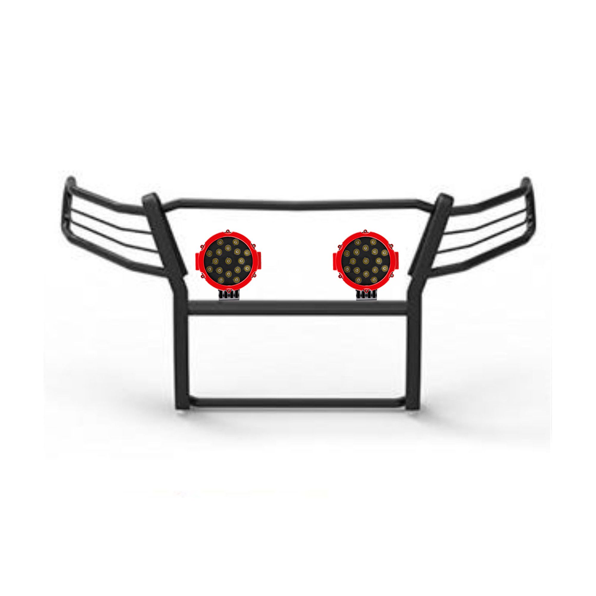Black Horse Off Road Grille Guard Kit Black Steel Modular Incl. pair of 7.0"Dia. LED Lights w/Red Trim Rings w/ Wiring Harness and Switch It May Interfere with Vehicles equipped with Emergency Braking Systems, Adaptive Cruise Control and Parking Sensors