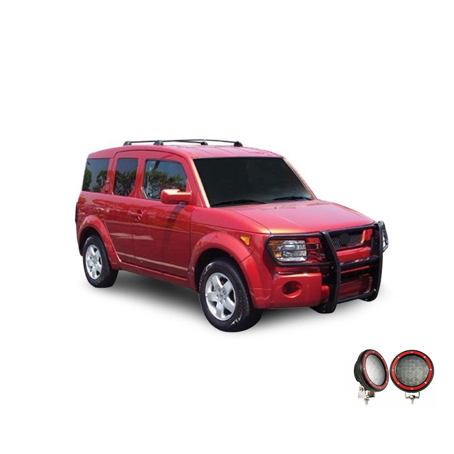Black Horse Off Road Grille Guard Kit Black Steel Modular Pair of 5.3" Dia. LED Flood Lights w/ Red Trim Rings Wiring Harness and Switch Excludes SC model