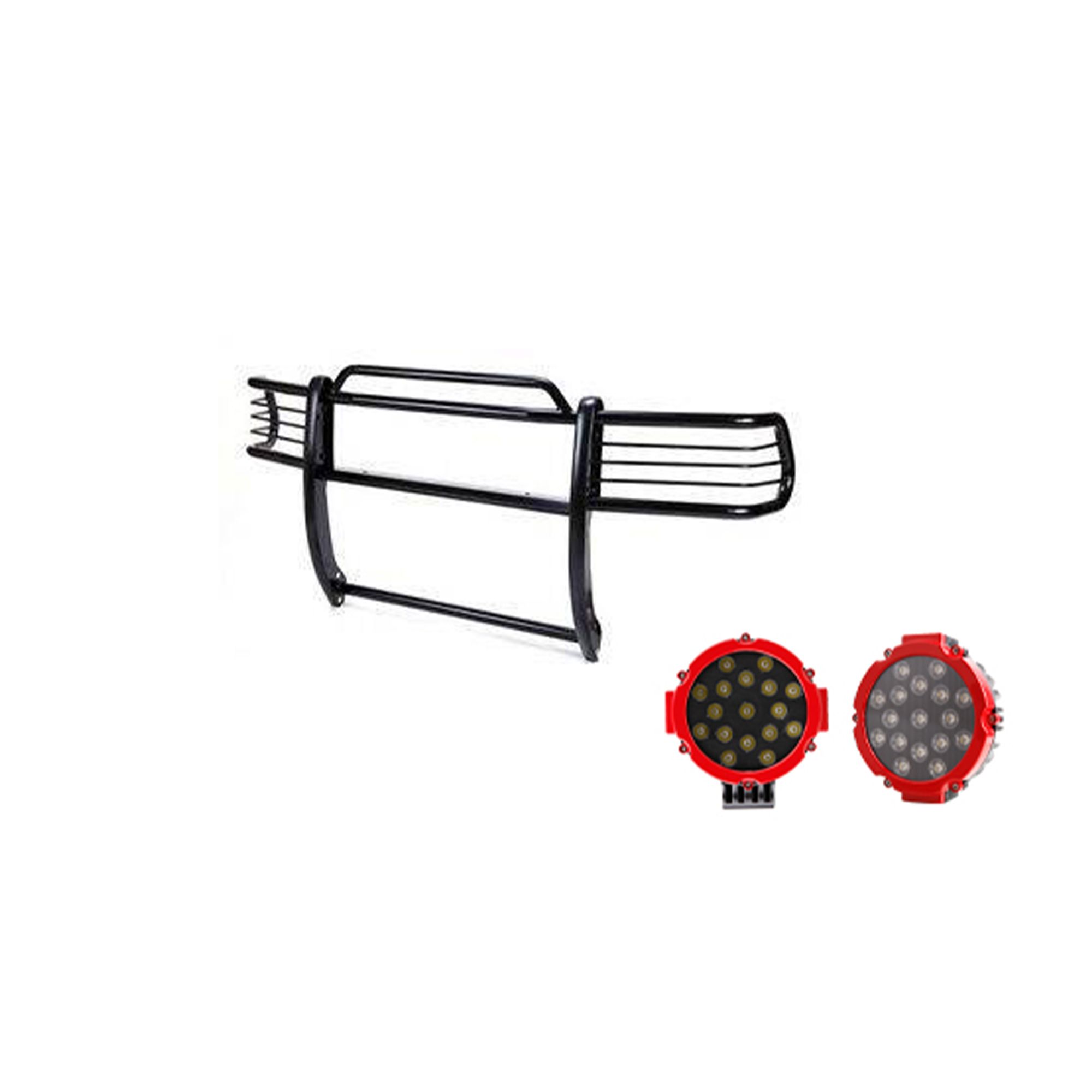 Black Horse Off Road Grille Guard Kit Black Steel Modular Incl. pair of 7.0"Dia. LED Lights w/Red Trim Rings w/ Wiring Harness and Switch