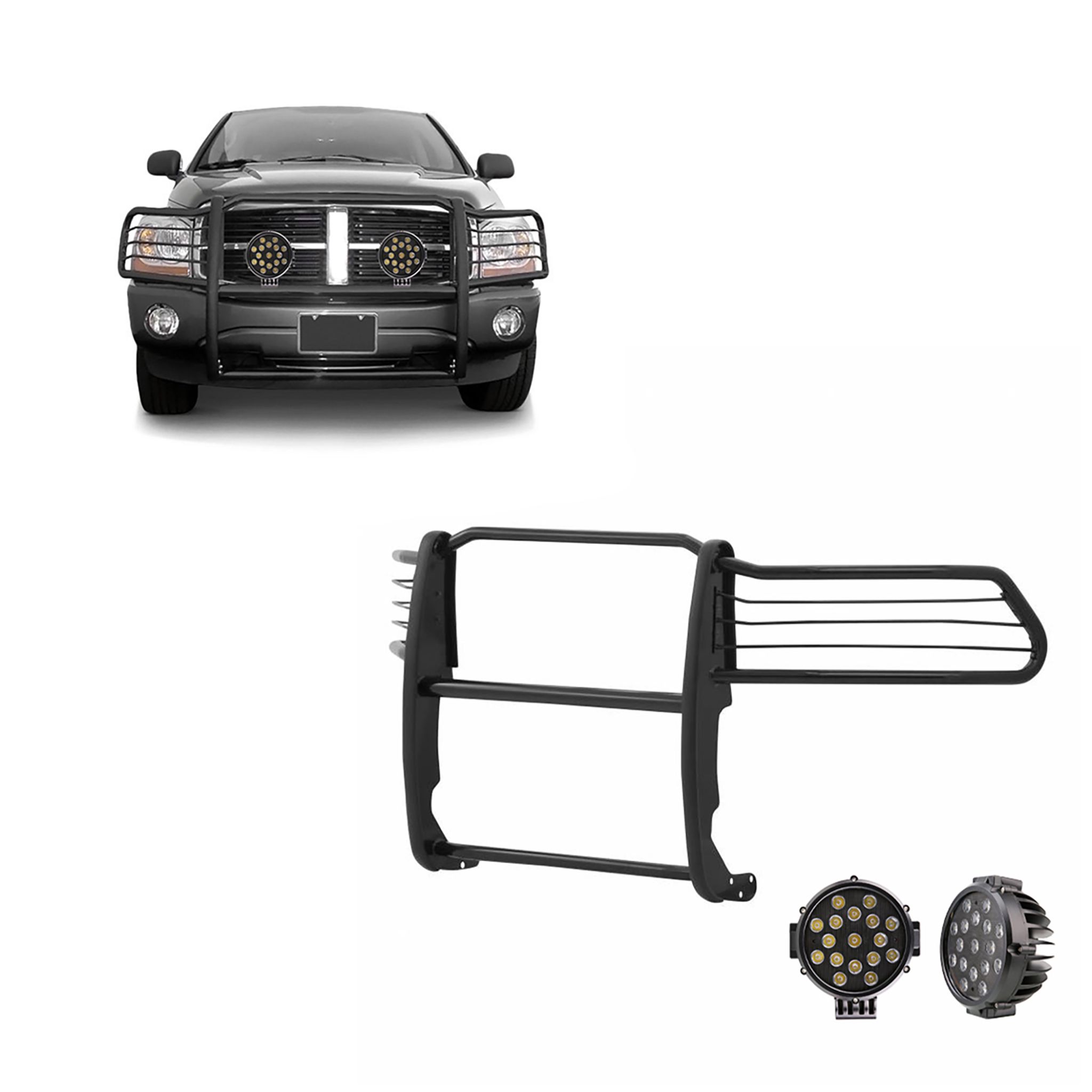 Black Horse Off Road Grille Guard Kit Black Steel Modular Incl. pair of 7.0"Dia. LED Lights w/ Black Trim Rings w/ Wiring Harness and Switch Excl.Rebel & Warlock Trims