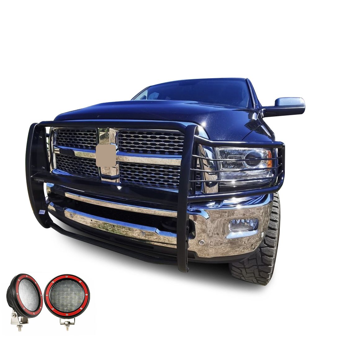Black Horse Off Road Grille Guard Kit Black Steel Modular Pair of 5.3" Dia. LED Flood Lights w/ Red Trim Rings Wiring Harness and Switch MAY INTERFERE WITH FRONT SENSORS Excl.Rebel & Warlock Trims It May Interfere with Vehicles equipped with Emergency Braking Systems, Adaptive Cruise Control and Parking Sensors