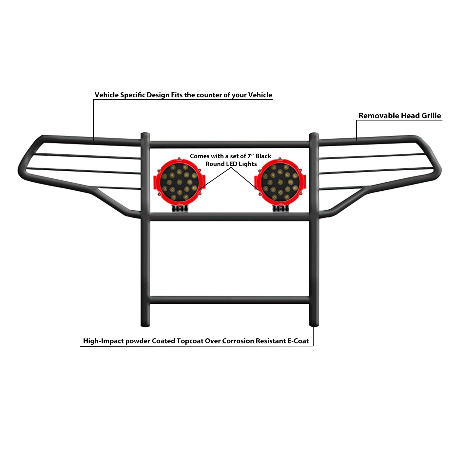 Black Horse Off Road Grille Guard Kit Black Steel Modular Incl. pair of 7.0"Dia. LED Lights w/Red Trim Rings w/ Wiring Harness and Switch Doesn't work with Adaptive Cruise Control Doesn't work with Adaptive Cruise Control It May Interfere with Vehicles equipped with Emergency Braking Systems, Adaptive Cruise Control and Parking Sensors