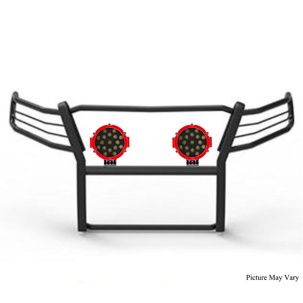 Black Horse Off Road Grille Guard Kit Black Steel Modular Incl. pair of 7.0"Dia. LED Lights w/Red Trim Rings w/ Wiring Harness and Switch Excludes ZR2 submodel It May Interfere with Vehicles equipped with Emergency Braking Systems, Adaptive Cruise Control and Parking Sensors