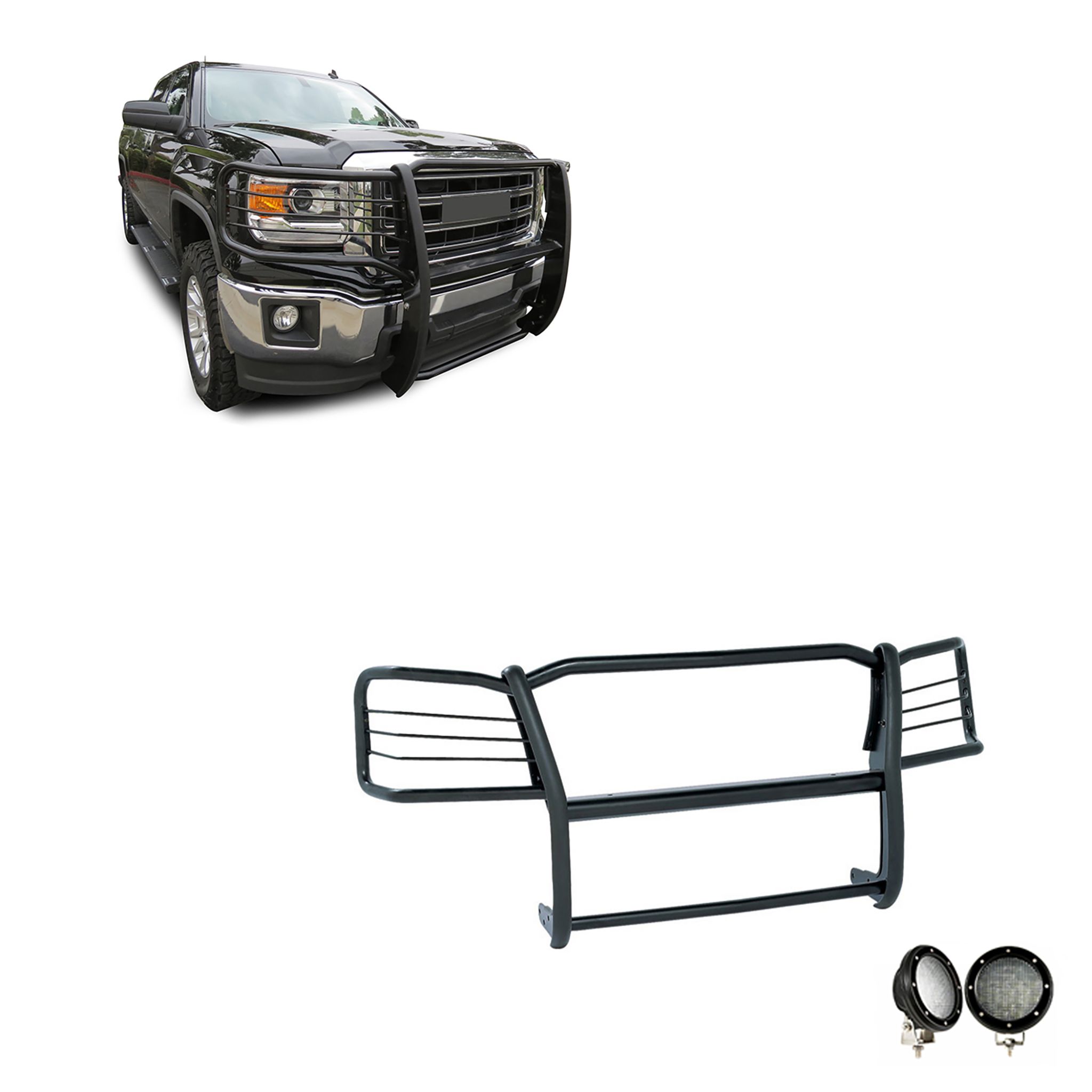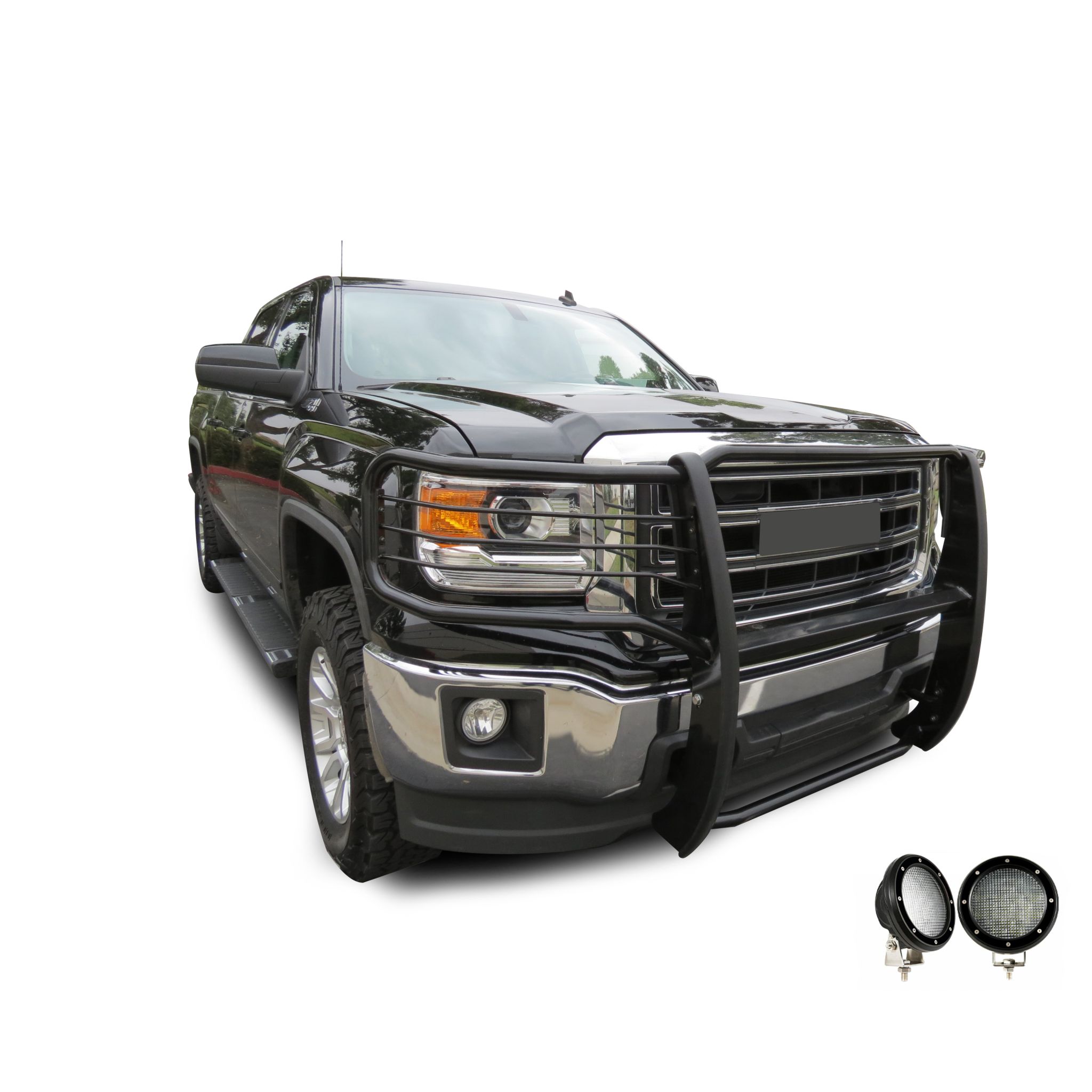 Black Horse Off Road Grille Guard Kit Black Steel Modular Pair of 5.3" Dia. LED Flood Lights w/ Black Trim Rings Wiring Harness and Switch Excl. Denali It May Interfere with Vehicles equipped with Emergency Braking Systems, Adaptive Cruise Control and Parking Sensors