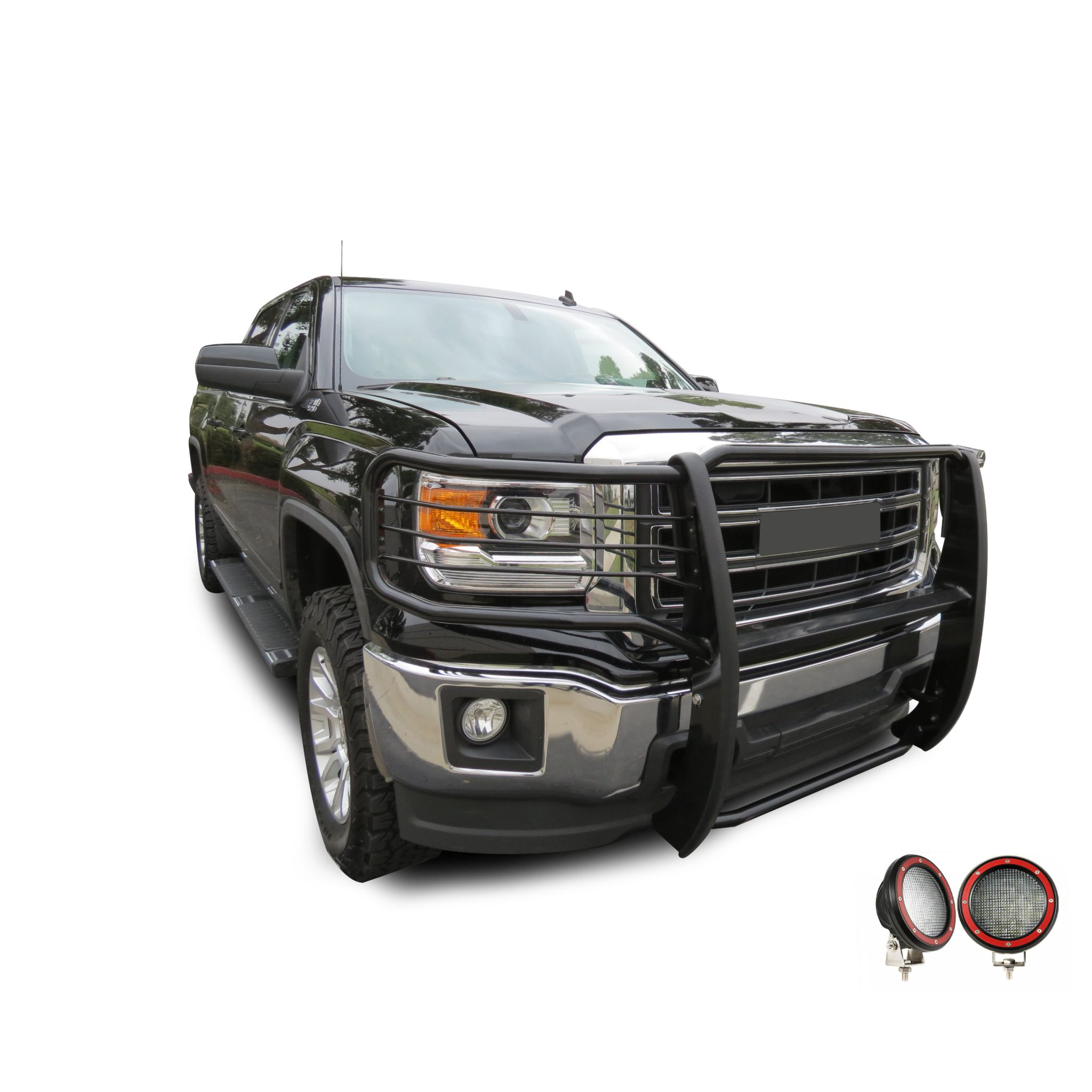 Black Horse Off Road Grille Guard Kit Black Steel Modular Pair of 5.3" Dia. LED Flood Lights w/ Red Trim Rings Wiring Harness and Switch Excl. Denali It May Interfere with Vehicles equipped with Emergency Braking Systems, Adaptive Cruise Control and Parking Sensors