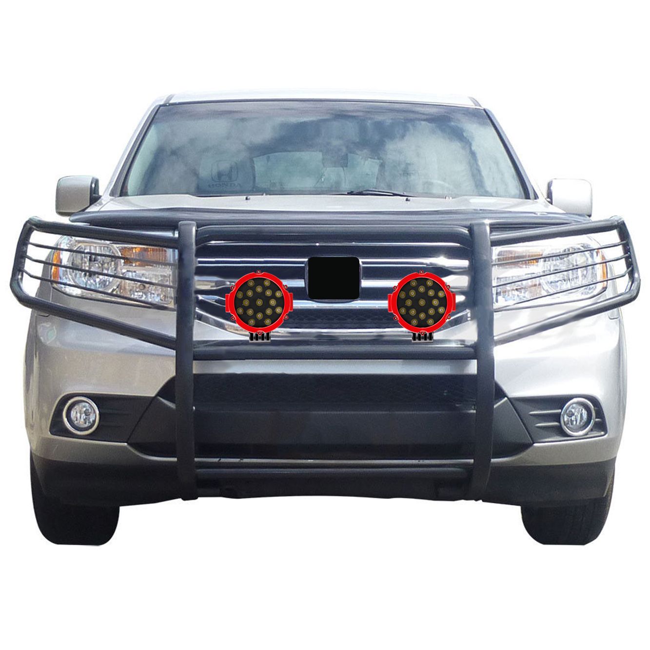Black Horse Off Road Grille Guard Kit Black Steel Modular Incl. pair of 7.0"Dia. LED Lights w/Red Trim Rings w/ Wiring Harness and Switch It May Interfere with Vehicles equipped with Emergency Braking Systems, Adaptive Cruise Control and Parking Sensors
