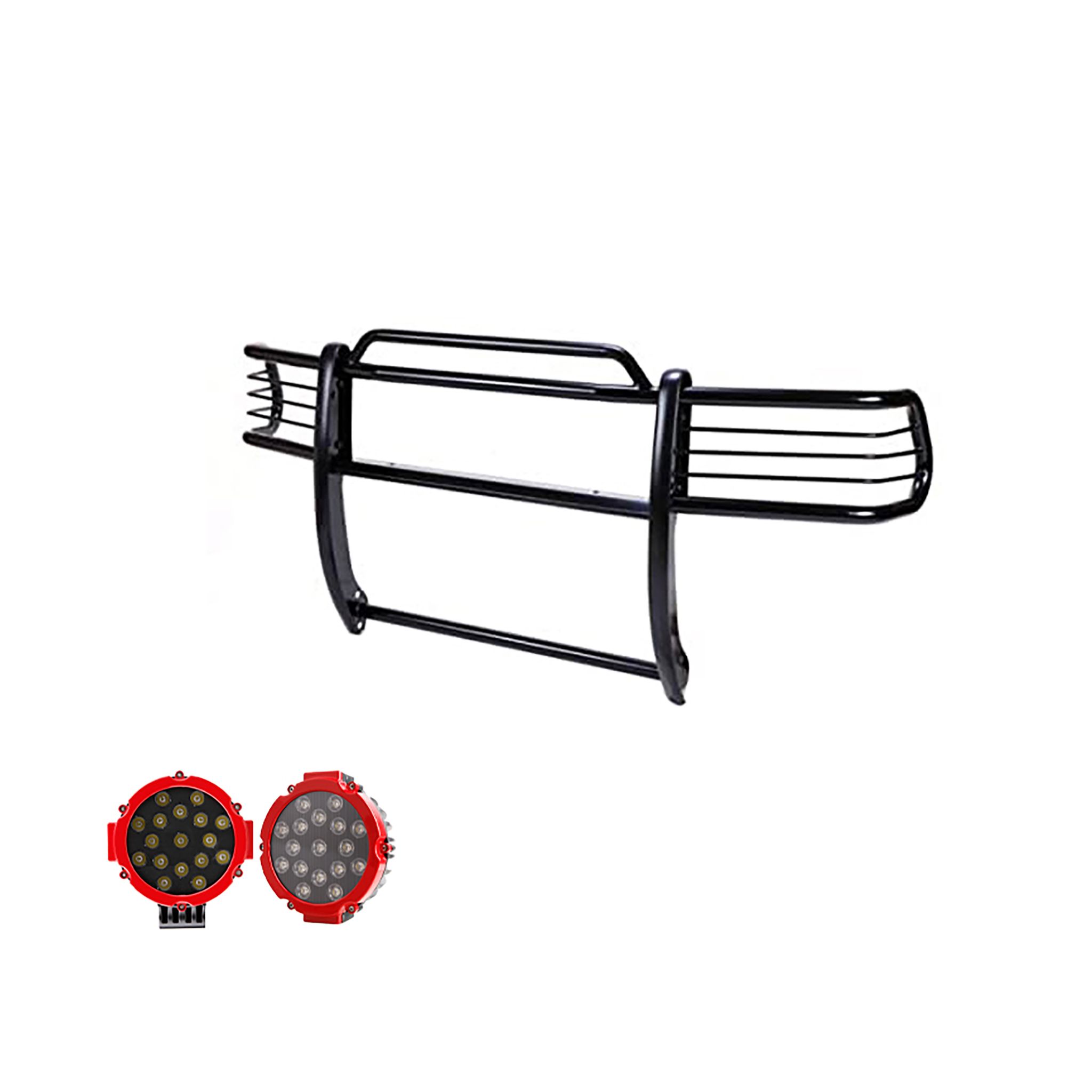 Black Horse Off Road Grille Guard Kit Black Steel Modular Incl. pair of 7.0"Dia. LED Lights w/Red Trim Rings w/ Wiring Harness and Switch