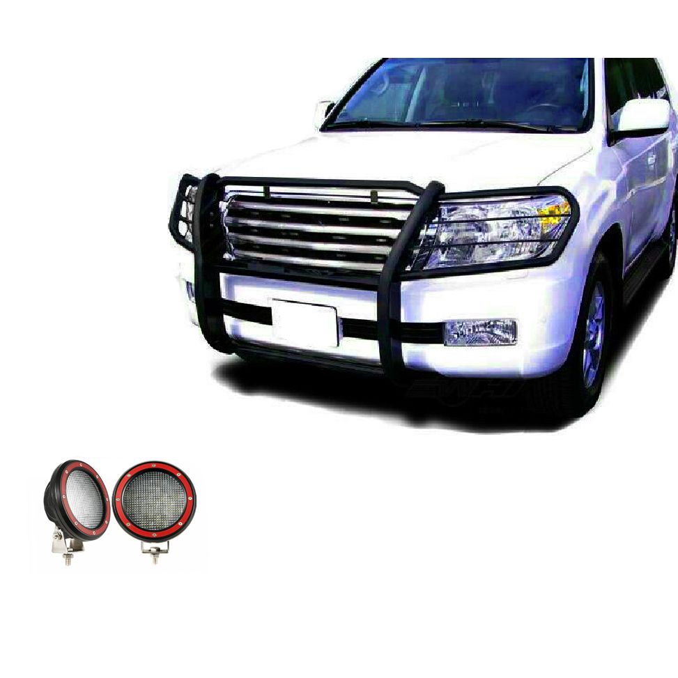 Black Horse Off Road Grille Guard Kit Black Steel Modular Pair of 5.3" Dia. LED Flood Lights w/ Red Trim Rings Wiring Harness and Switch