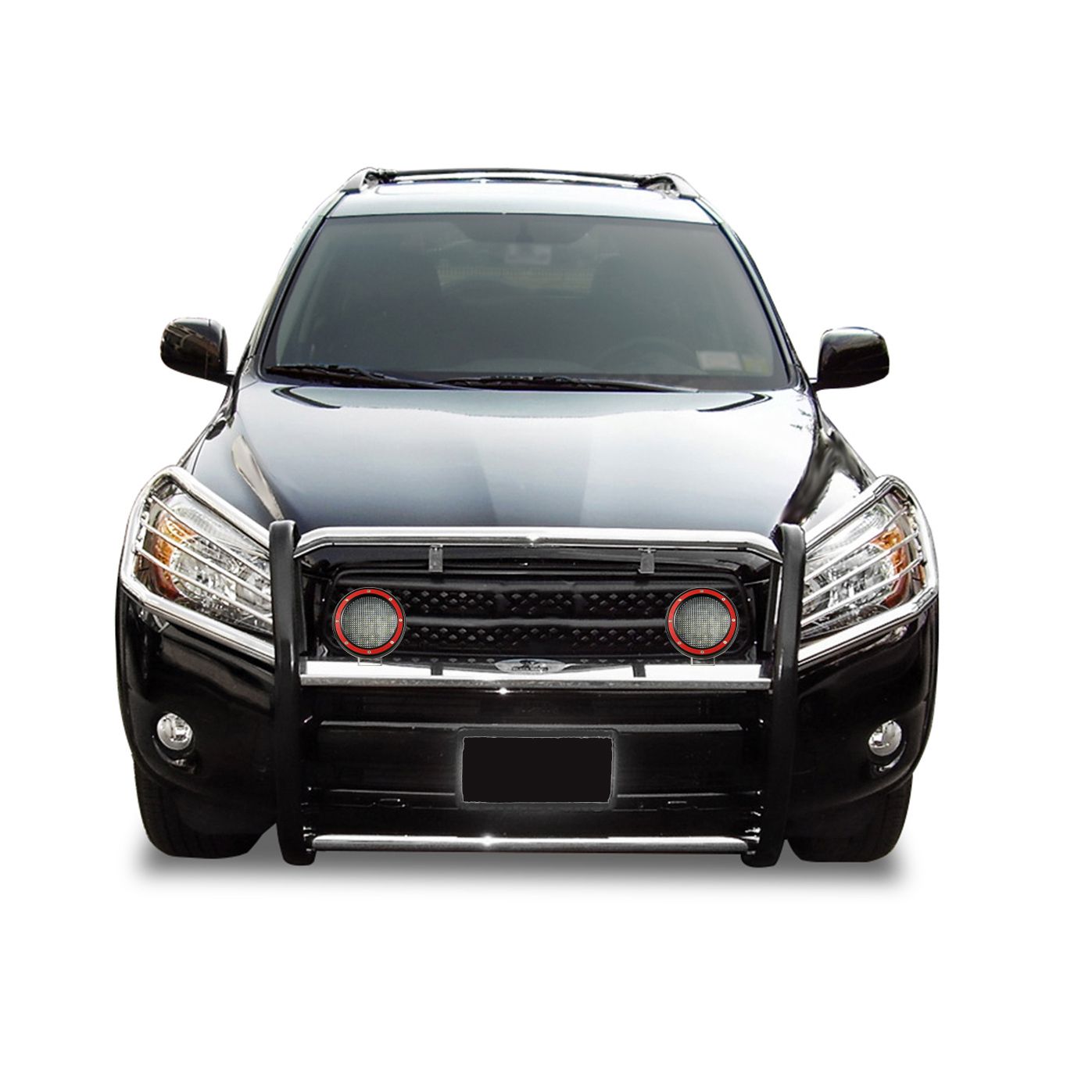 Black Horse Off Road Grille Guard Kit Stainless Steel Stainless Steel Modular Pair of 5.3" Dia. LED Flood Lights w/ Red Trim Rings Wiring Harness and Switch It May Interfere with Vehicles equipped with Emergency Braking Systems, Adaptive Cruise Control and Parking Sensors