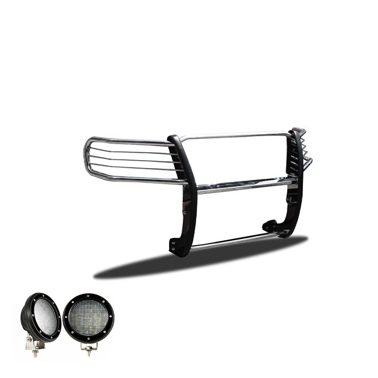Black Horse Off Road Grille Guard Kit Stainless Steel Stainless Steel Modular Pair of 5.3" Dia. LED Flood Lights w/ Black Trim Rings Wiring Harness and Switch Excl. 08-21 Platinum/Limited model It May Interfere with Vehicles equipped with Emergency Braking Systems, Adaptive Cruise Control and Parking Sensors