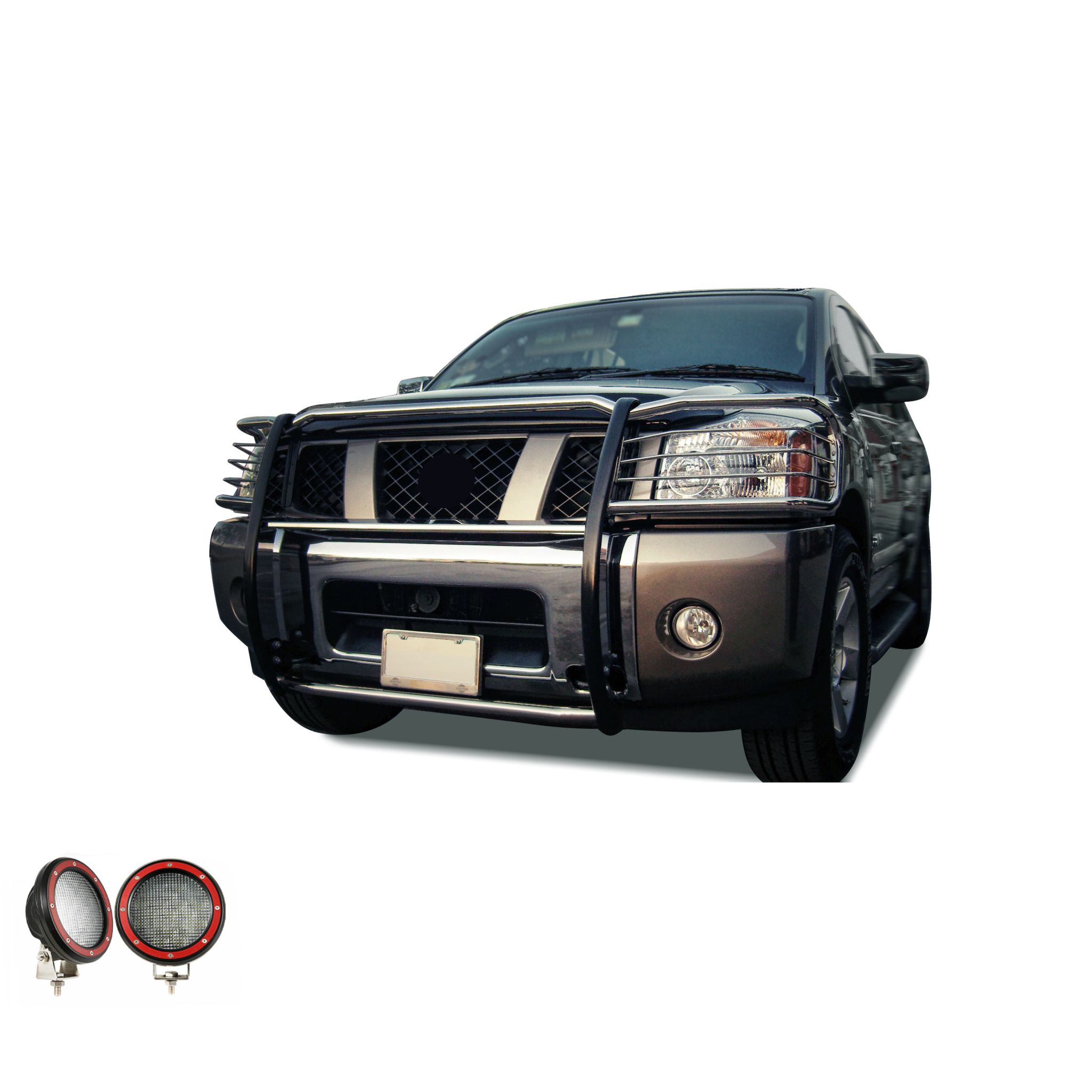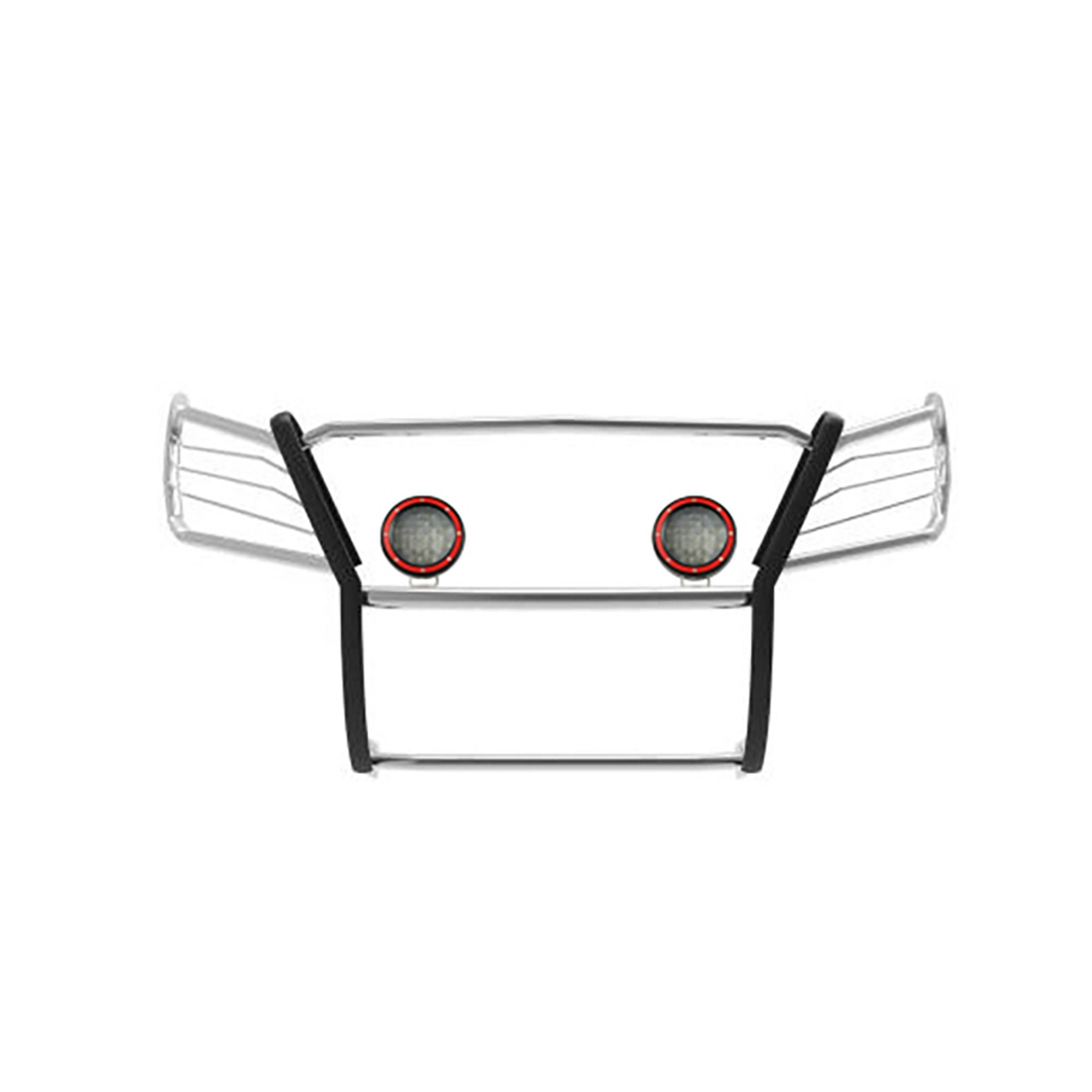 Black Horse Off Road Grille Guard Kit Stainless Steel Stainless Steel Modular Pair of 5.3" Dia. LED Flood Lights w/ Red Trim Rings Wiring Harness and Switch It May Interfere with Vehicles equipped with Emergency Braking Systems, Adaptive Cruise Control and Parking Sensors