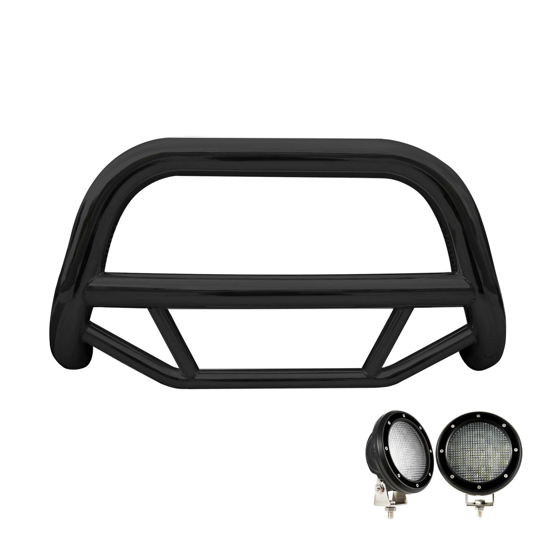 Black Horse Off Road Max Bull Bar Kit Black Steel No skid plate Pair of 5.3" Dia. LED Flood Lights w/ Black Trim Rings Wiring Harness and Switch It May Interfere with Vehicles equipped with Emergency Braking Systems, Adaptive Cruise Control and Parking Sensors