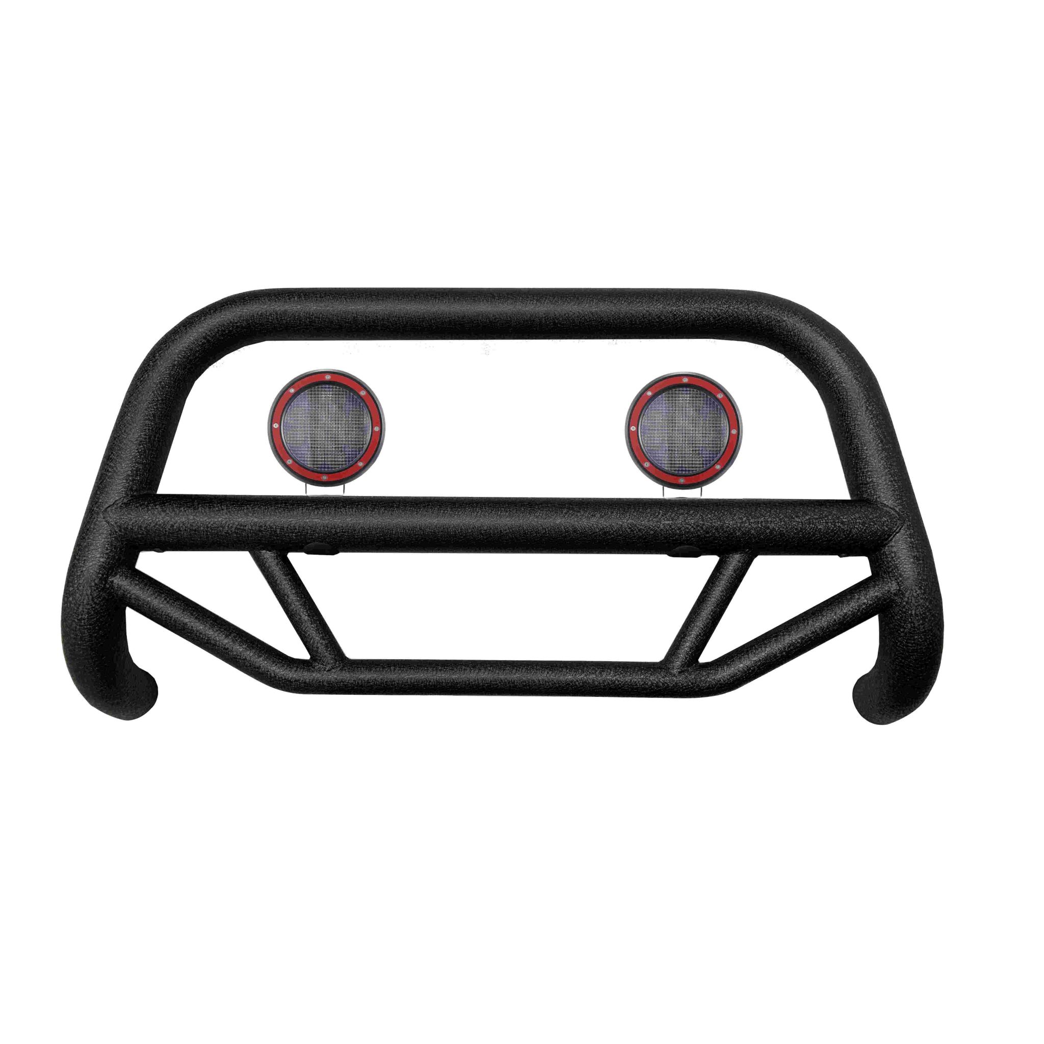 Black Horse Off Road Max T Bull Bar Kit Textured Black Steel Pair of 5.3" Dia. LED Flood Lights w/ Red Trim Rings Wiring Harness and Switch come with License plate Relocator 2.5" Dia Tube It May Interfere with Vehicles equipped with Emergency Braking Systems, Adaptive Cruise Control and Parking Sensors
