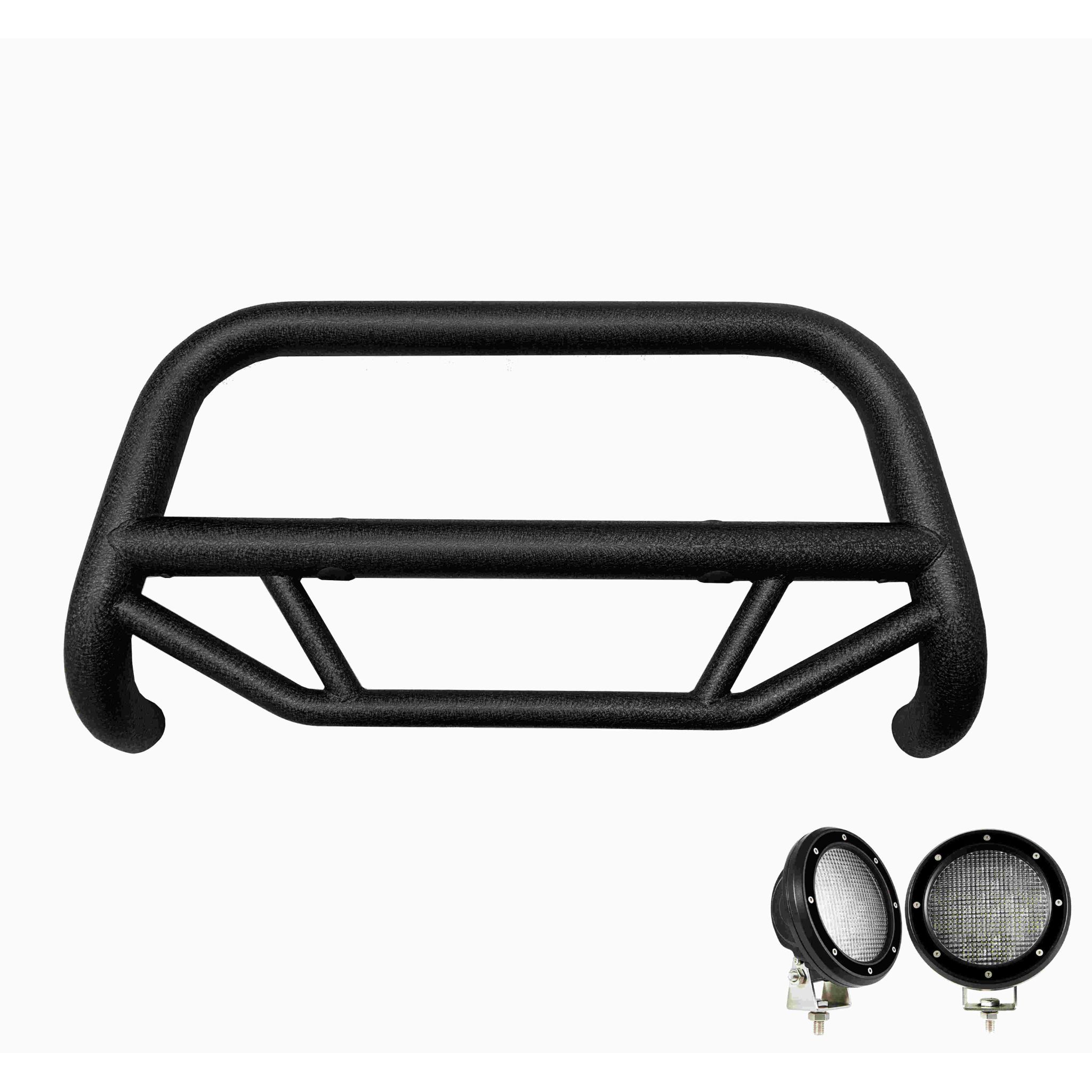 Black Horse Off Road Max T Bull Bar Kit Textured Black Steel Pair of 5.3" Dia. LED Flood Lights w/ Black Trim Rings Wiring Harness and Switch come with License plate Relocator Include 07 "Classic" 1500LD 2.5" Dia Tube