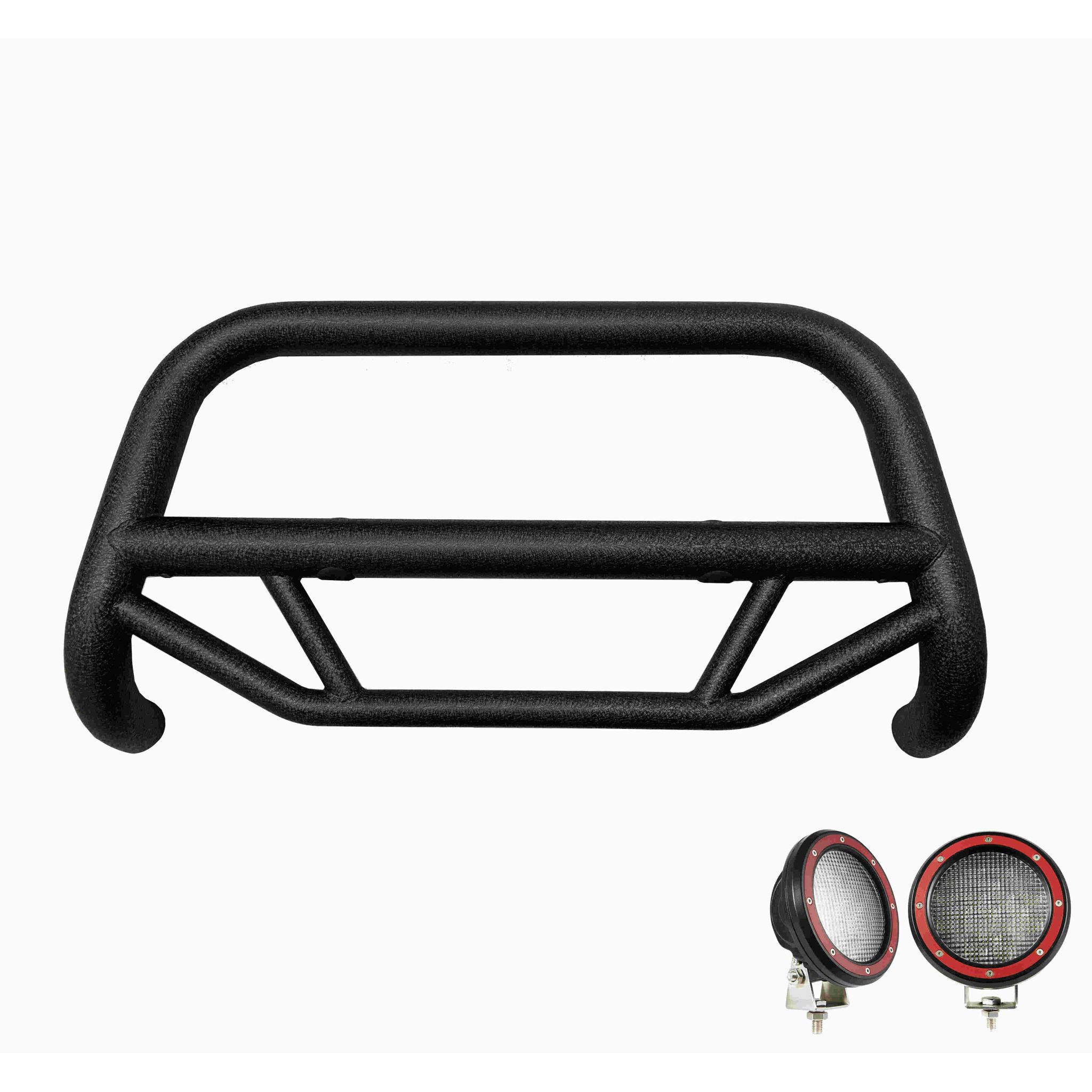 Black Horse Off Road Max T Bull Bar Kit Textured Black Steel Pair of 5.3" Dia. LED Flood Lights w/ Red Trim Rings Wiring Harness and Switch come with License plate Relocator 2.5" Dia Tube It May Interfere with Vehicles equipped with Emergency Braking Systems, Adaptive Cruise Control and Parking Sensors