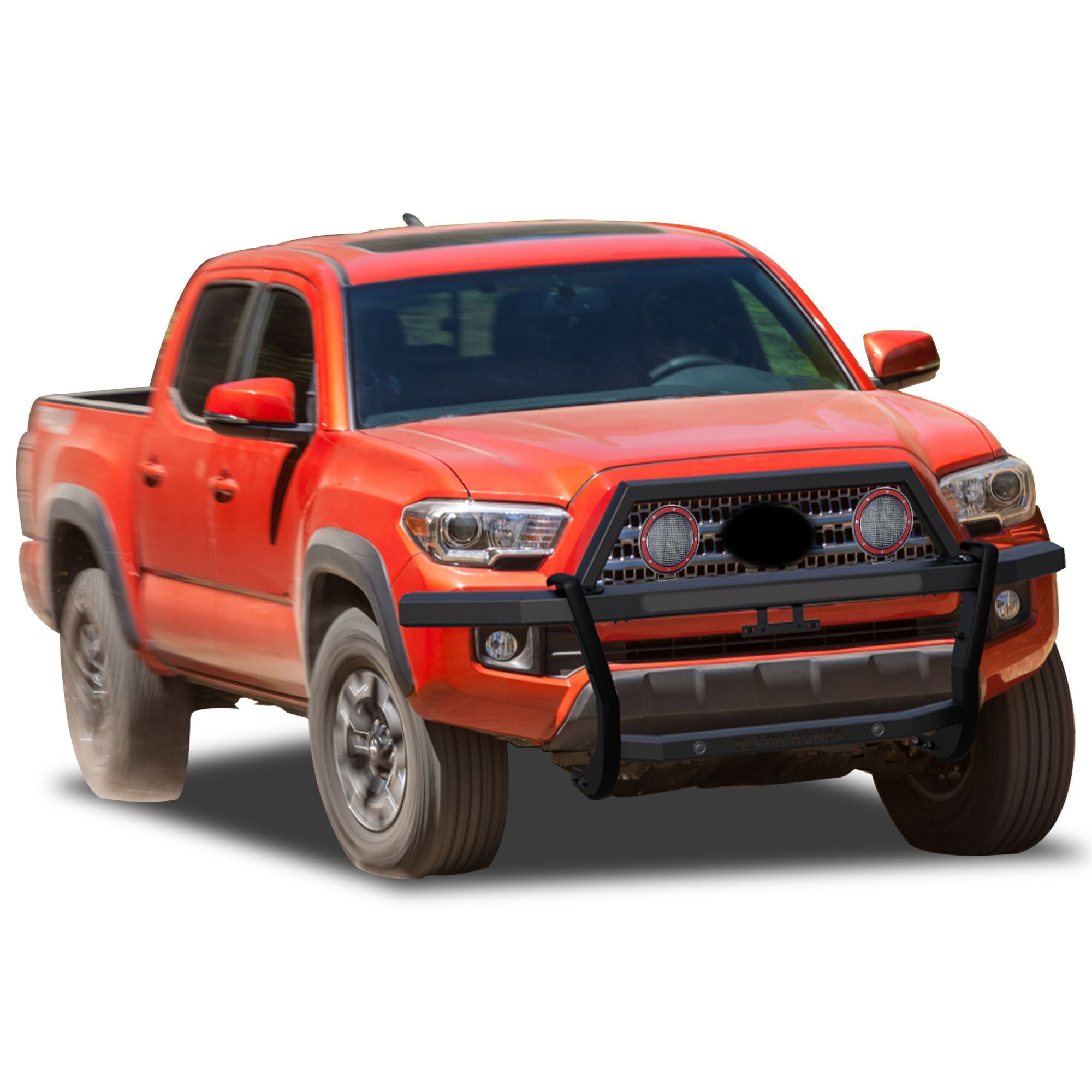 Black Horse Off Road Rambler Grille Guard Kit Black Steel Modular Includes a set of 5.3" Dia. LED Flood Lights w/ Red Trim Rings Wiring Harness and Switch