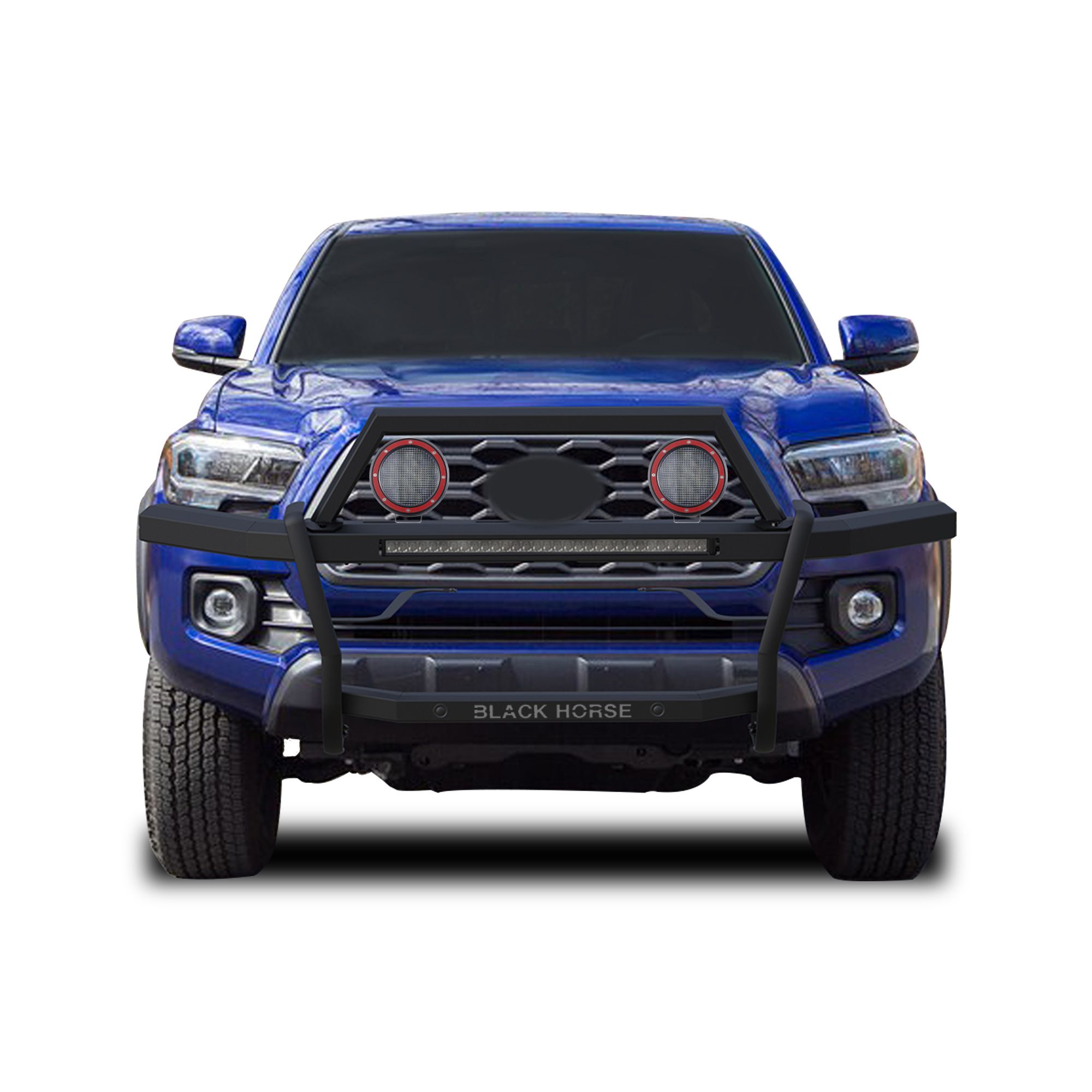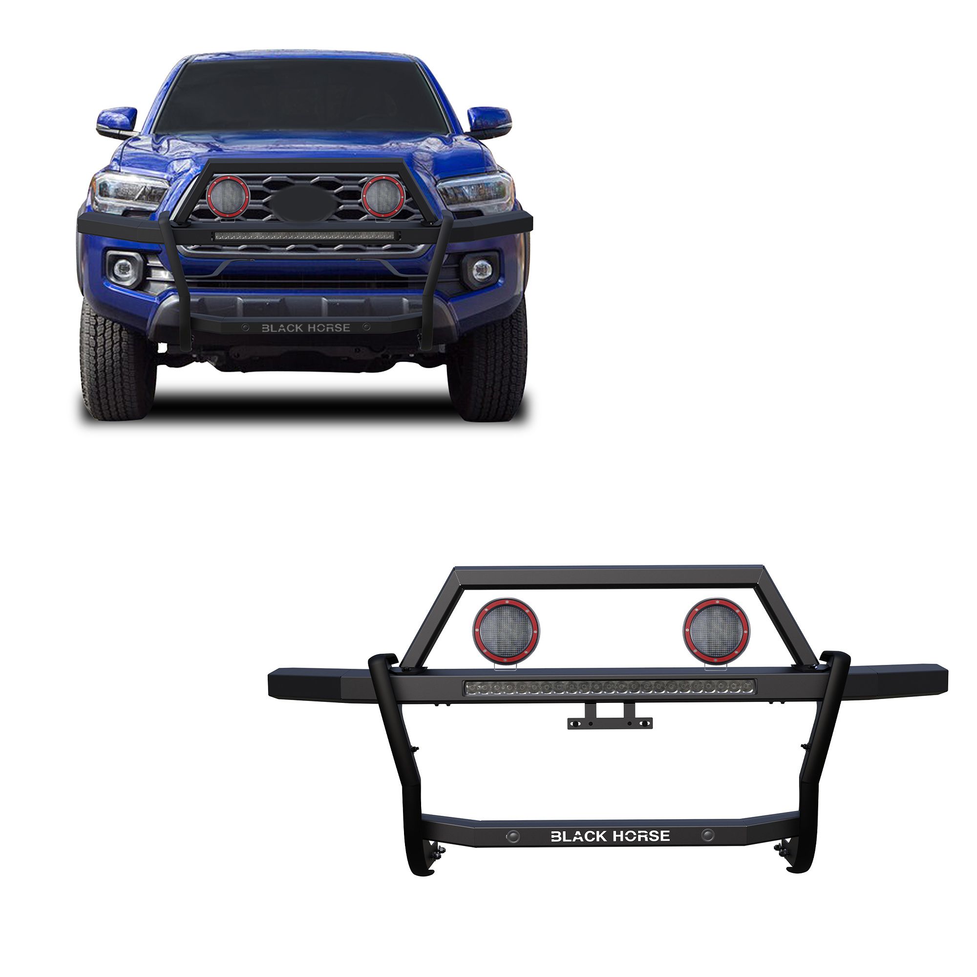 Black Horse Off Road Rambler Grille Guard Kit Black Steel Modular Includes 30" LED Bar Single Row & a set of 5.3" Dia. LED Flood Lights w/ Red Trim Rings Wiring Harness and Switch