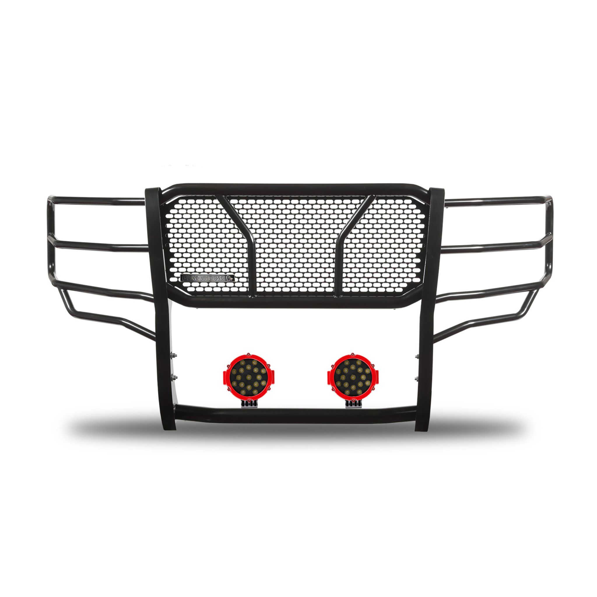 Black Horse Off Road Rugged Heavy Duty Grille Guard Kit Black Steel Modular Box 2: 39.37, 23.22, 11.22 inchs, 34.61 lbs & Incl. pair of 7.0" Dia. LED Lights w/ Red Trim Rings w/ Wiring Harness and Switch It May Interfere with Vehicles equipped with Emergency Braking Systems, Adaptive Cruise Control and Parking Sensors