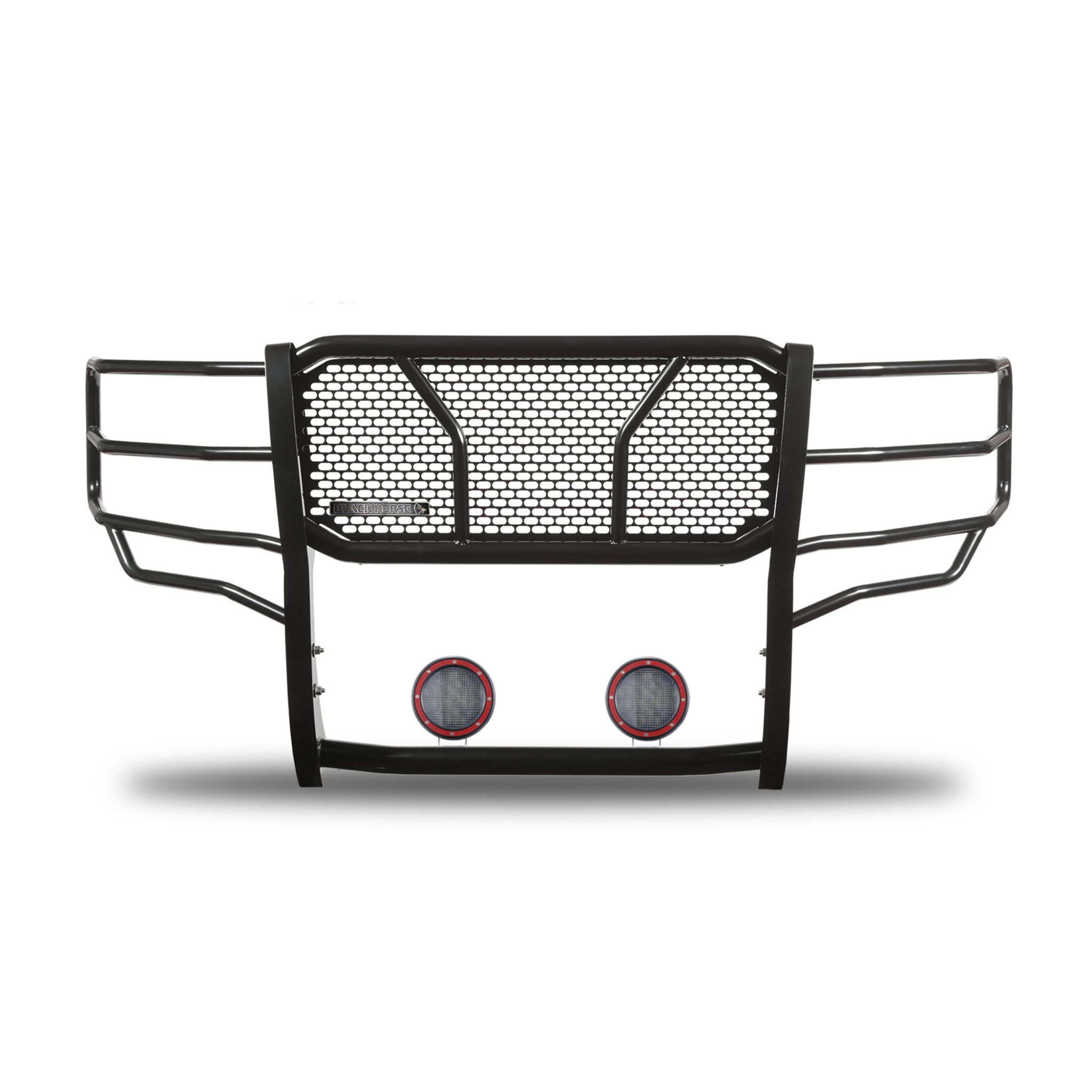Black Horse Off Road Rugged Heavy Duty Grille Guard Kit Black Steel Modular Pair of 5.3" Dia. LED Flood Lights w/ Red Trim Rings Wiring Harness and Switch Excludes models with Active Grille Shutters 2014 and up It May Interfere with Vehicles equipped with Emergency Braking Systems, Adaptive Cruise Control and Parking Sensors