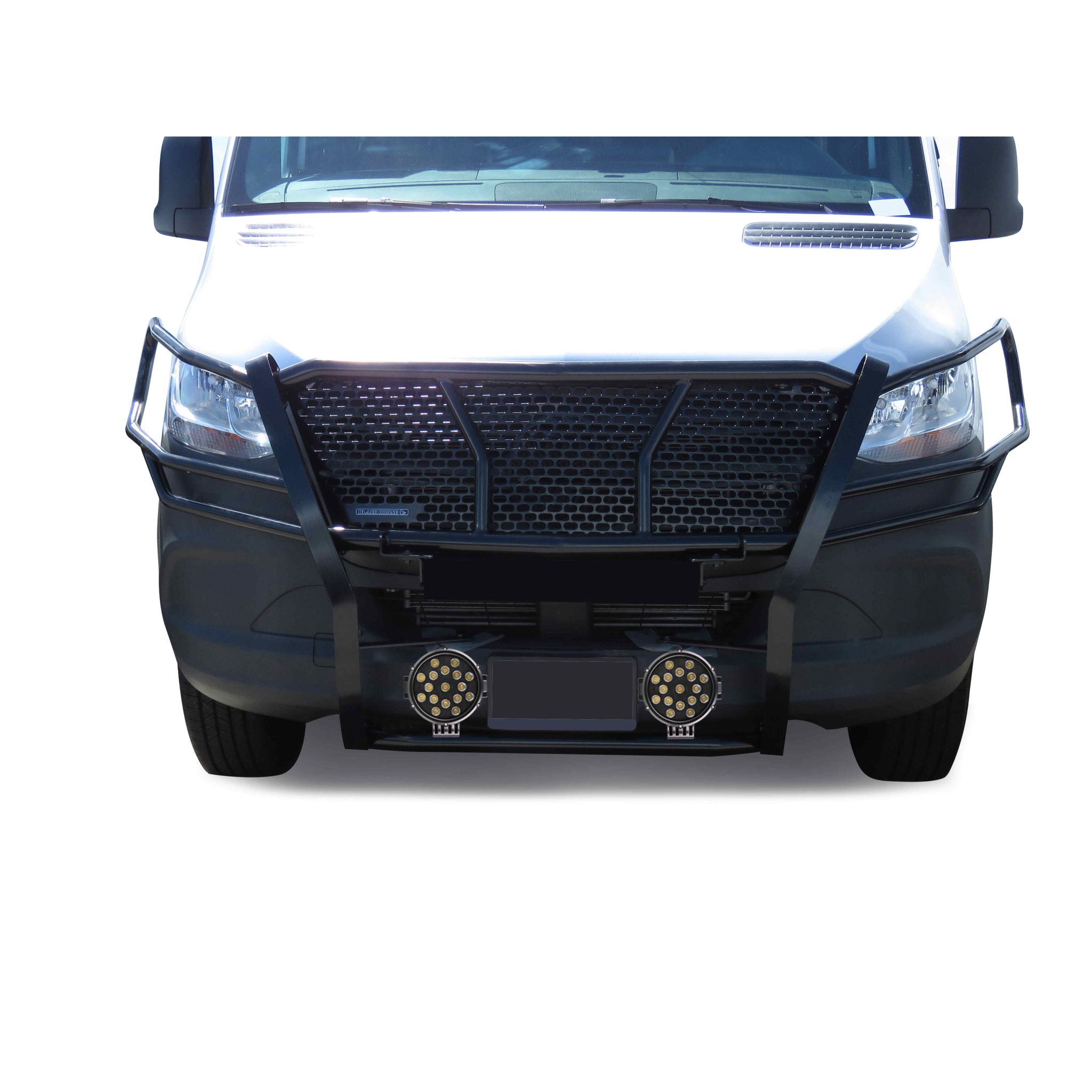 Black Horse Off Road Rugged Heavy Duty Grille Guard Kit Black Steel Modular Incl. pair of 7.0" Dia. LED Lights w/ Black Trim Rings w/ Wiring Harness and Switch Excl. 3500 Dually, 2/4 WD It May Interfere with Vehicles equipped with Emergency Braking Systems, Adaptive Cruise Control and Parking Sensors