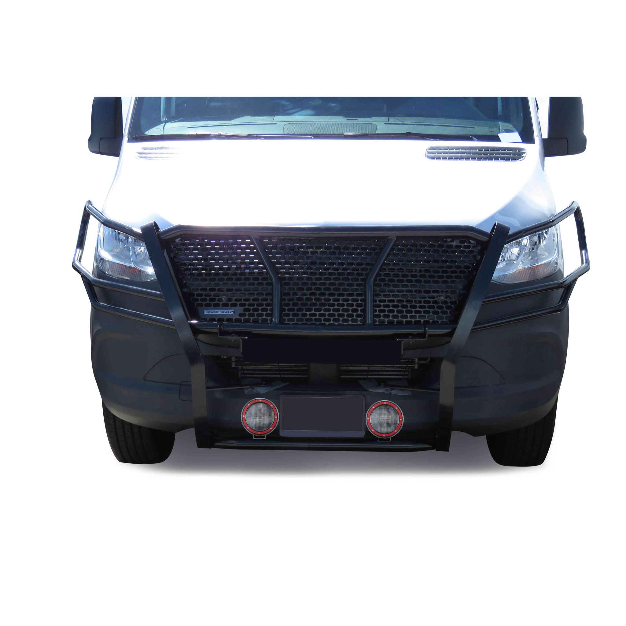 Black Horse Off Road Rugged Heavy Duty Grille Guard Kit Black Steel Modular Pair of 5.3" Dia. LED Flood Lights w/ Red Trim Rings Wiring Harness and Switch Excl. 3500 Dually, 2/4 WD It May Interfere with Vehicles equipped with Emergency Braking Systems, Adaptive Cruise Control and Parking Sensors