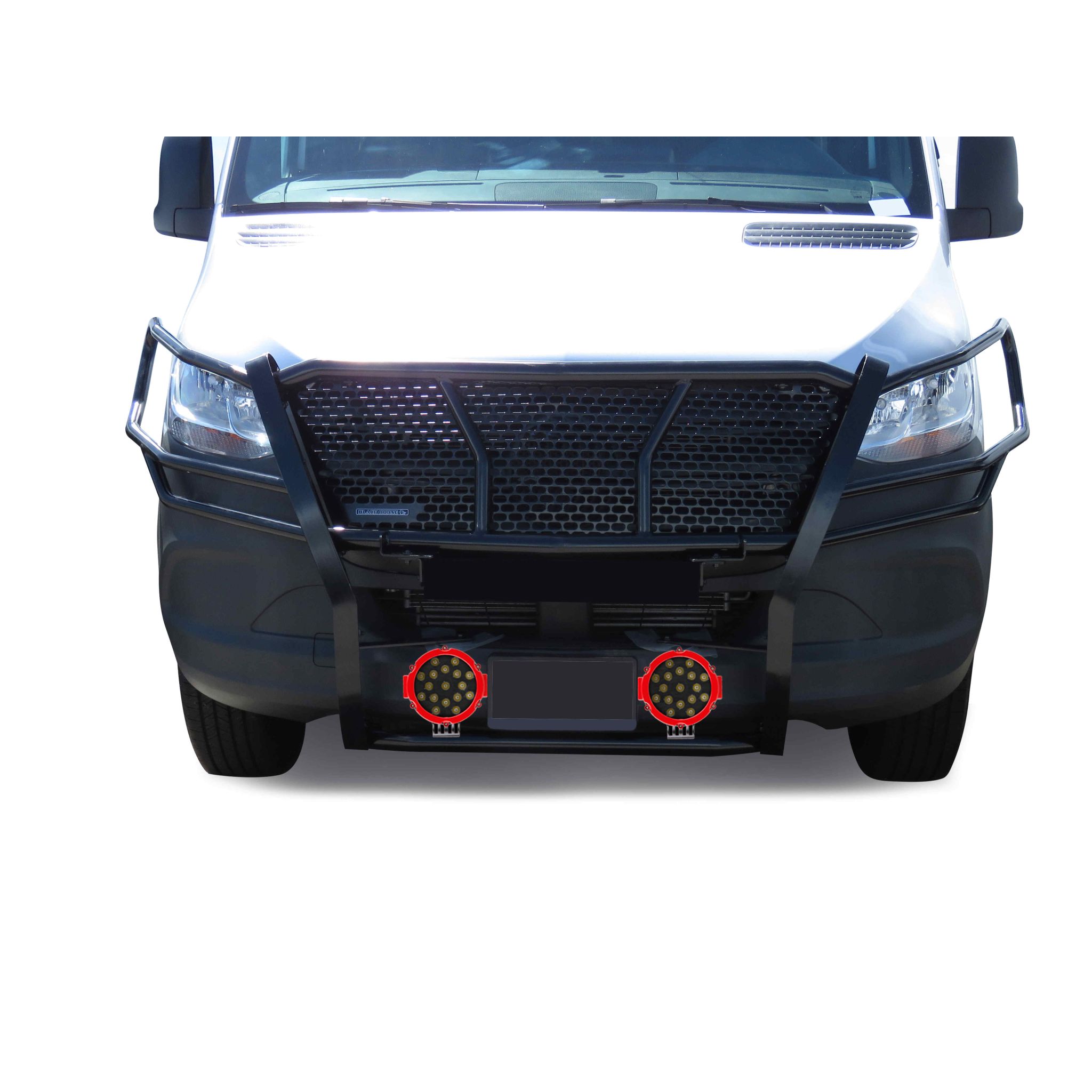 Black Horse Off Road Rugged Heavy Duty Grille Guard Kit Black Steel Modular Incl. pair of 7.0" Dia. LED Lights w/ Red Trim Rings w/ Wiring Harness and Switch Excl. 3500 Dually, 2/4 WD It May Interfere with Vehicles equipped with Emergency Braking Systems, Adaptive Cruise Control and Parking Sensors