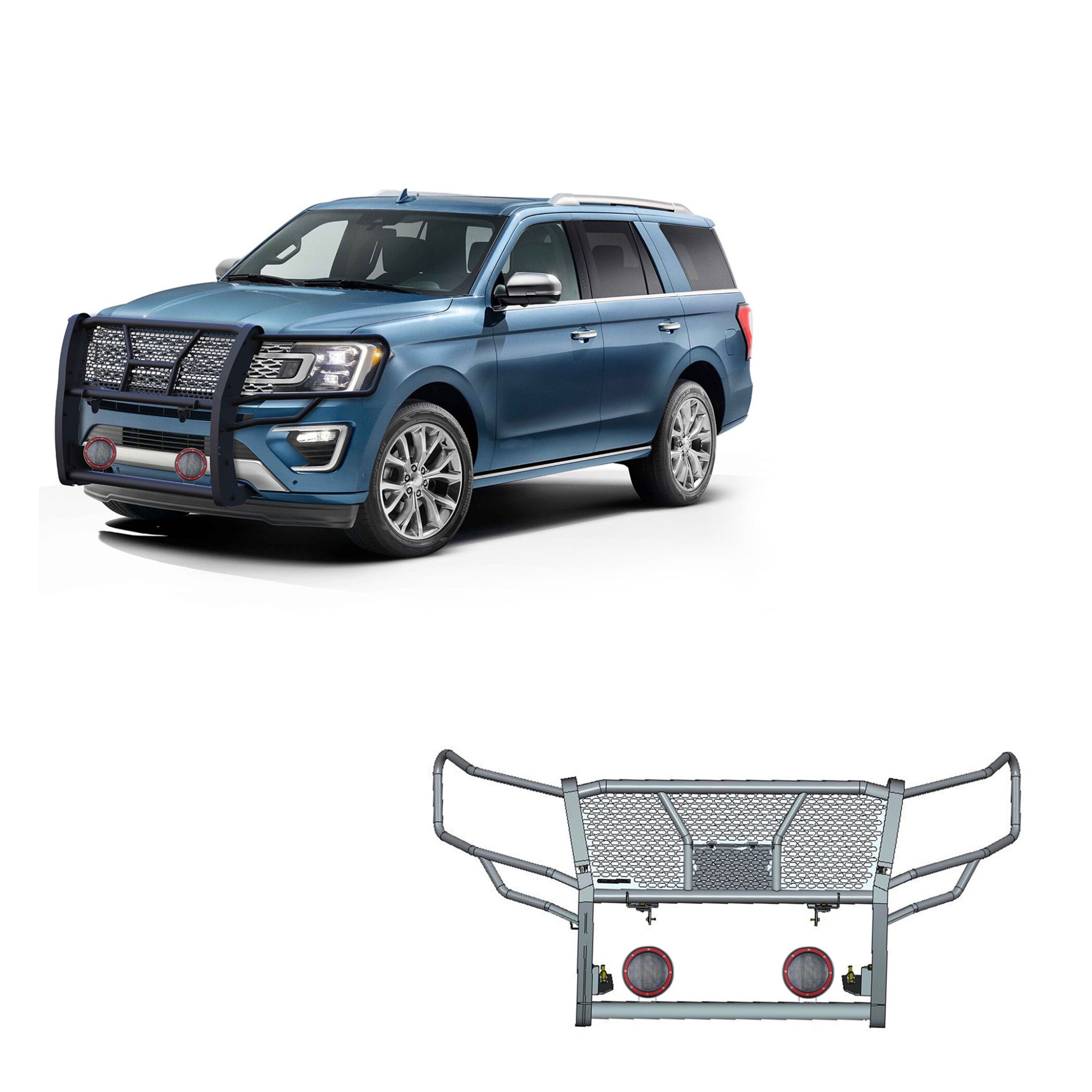 Black Horse Off Road Rugged Heavy Duty Grille Guard Kit Black Steel Modular Pair of 5.3" Dia. LED Flood Lights w/ Red Trim Rings Wiring Harness and Switch It May Interfere with Vehicles equipped with Emergency Braking Systems, Adaptive Cruise Control and Parking Sensors