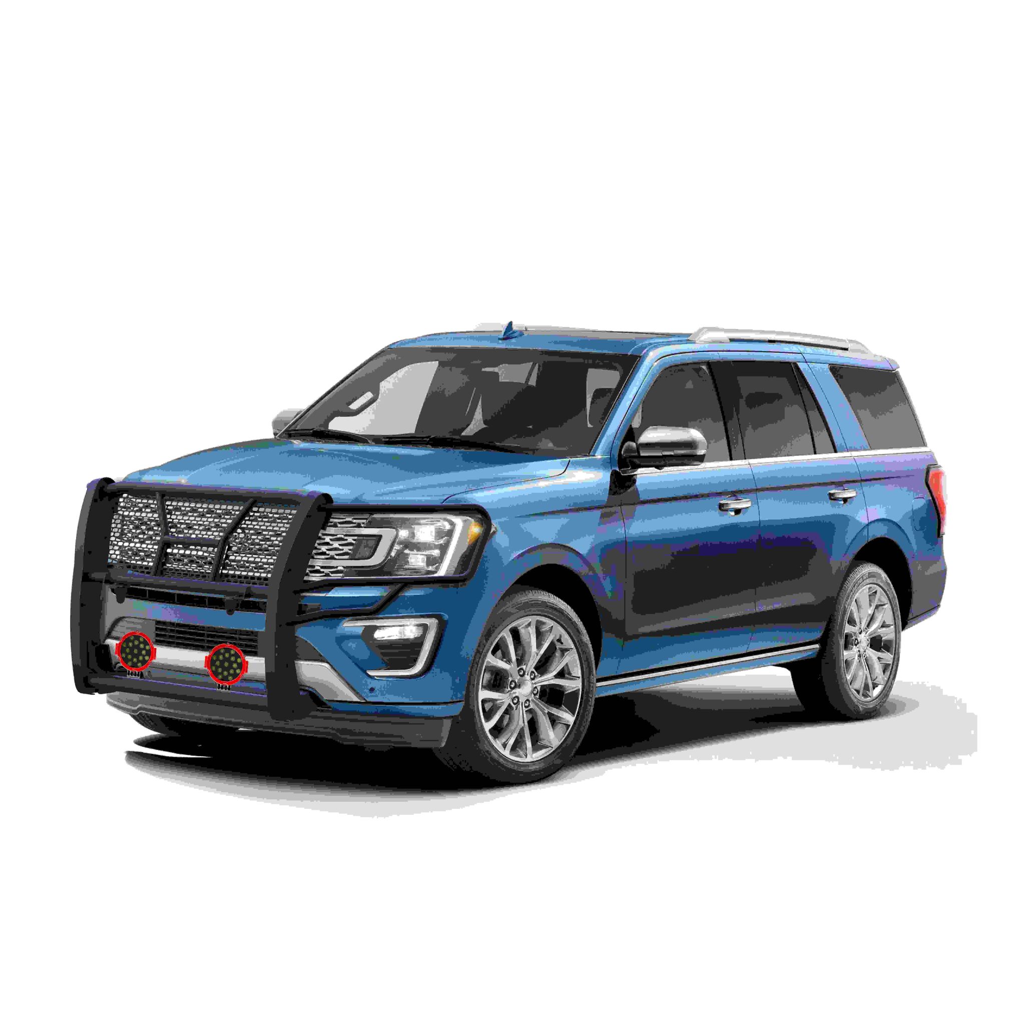 Black Horse Off Road Rugged Heavy Duty Grille Guard Kit Black Steel Modular Incl. pair of 7.0" Dia. LED Lights w/ Red Trim Rings w/ Wiring Harness and Switch It May Interfere with Vehicles equipped with Emergency Braking Systems, Adaptive Cruise Control and Parking Sensors