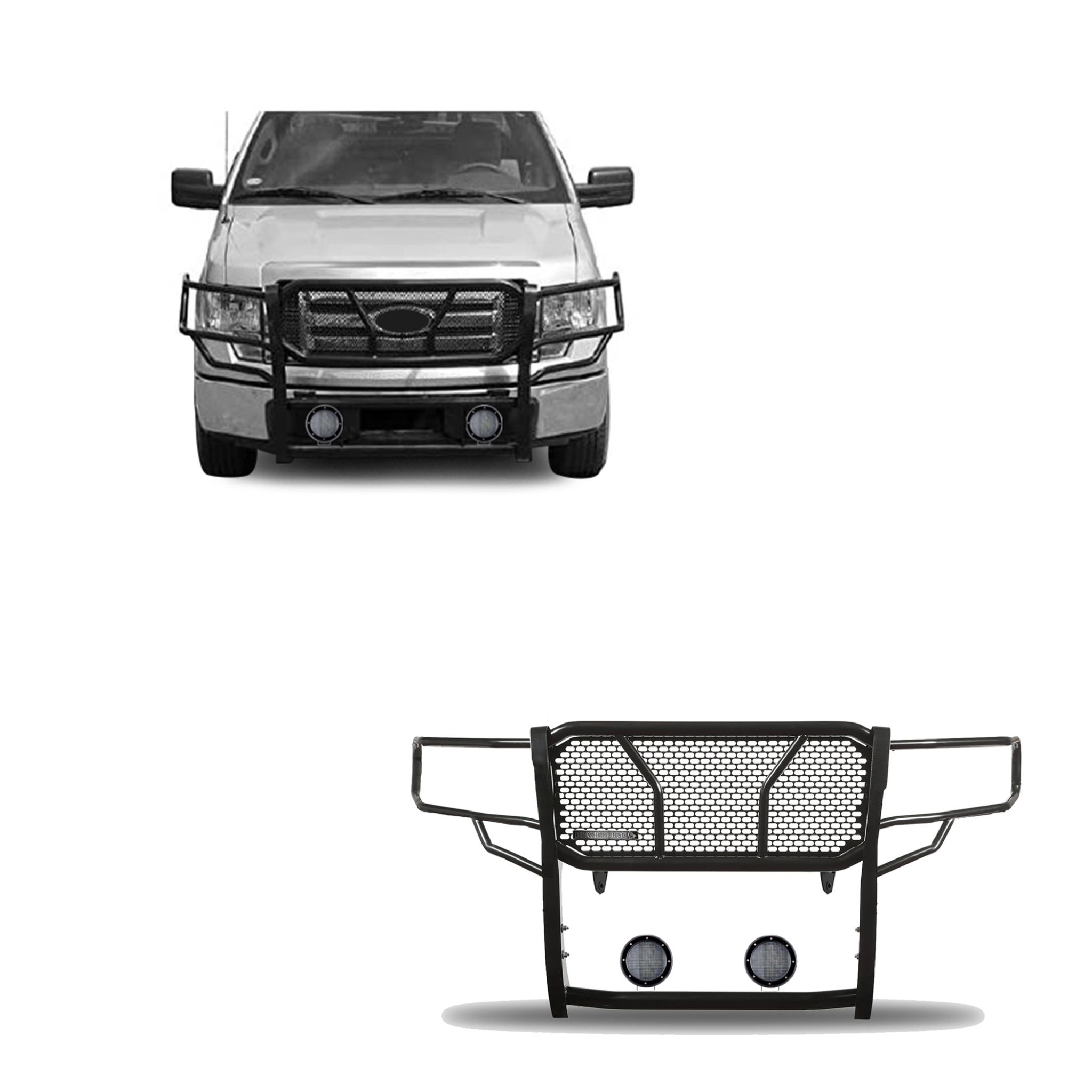 Black Horse Off Road Rugged Heavy Duty Grille Guard Kit Black Steel Modular Pair of 5.3" Dia. LED Flood Lights w/ Black Trim Rings Wiring Harness and Switch incl. Eco Boost & Excl. 10-14 F150 Raptor models It May Interfere with Vehicles equipped with Emergency Braking Systems, Adaptive Cruise Control and Parking Sensors