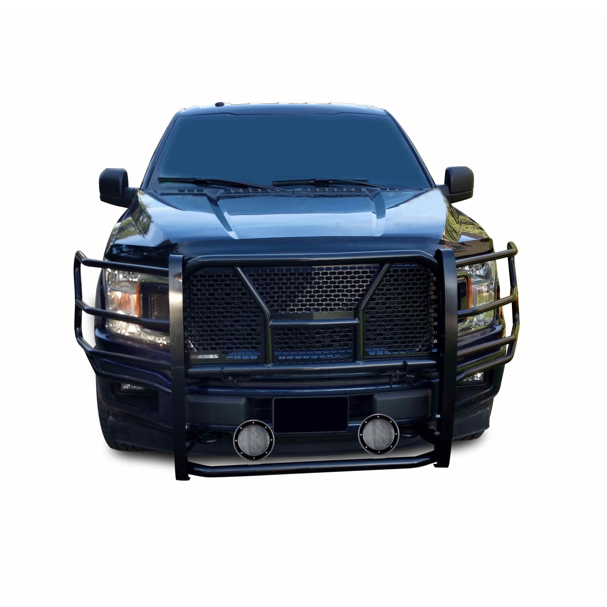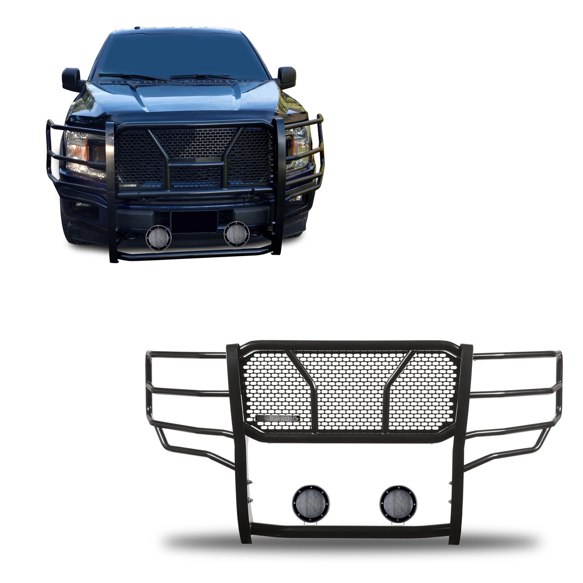 Black Horse Off Road Rugged Heavy Duty Grille Guard Kit Black Steel Modular Pair of 5.3" Dia. LED Flood Lights w/ Black Trim Rings Wiring Harness and Switch Excl. 2020 Diesel Models It May Interfere with Vehicles equipped with Emergency Braking Systems, Adaptive Cruise Control and Parking Sensors