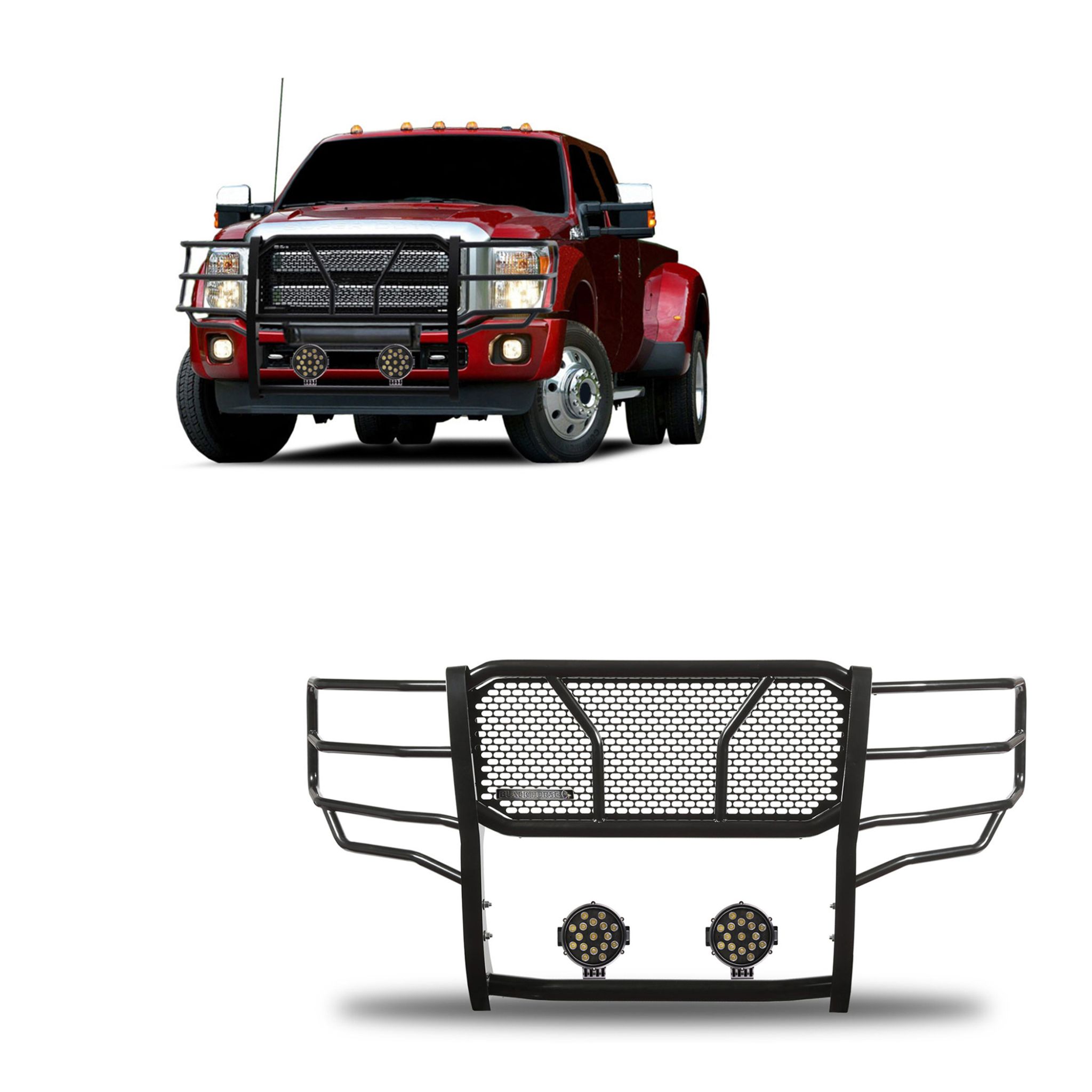 Black Horse Off Road Rugged Heavy Duty Grille Guard Kit Black Steel Modular 2nd Box: 42.51, 25.98, 12.59 inch , 44.97 lbs & Incl. pair of 7.0" Dia. LED Lights w/ Black Trim Rings w/ Wiring Harness and Switch It May Interfere with Vehicles equipped with Emergency Braking Systems, Adaptive Cruise Control and Parking Sensors