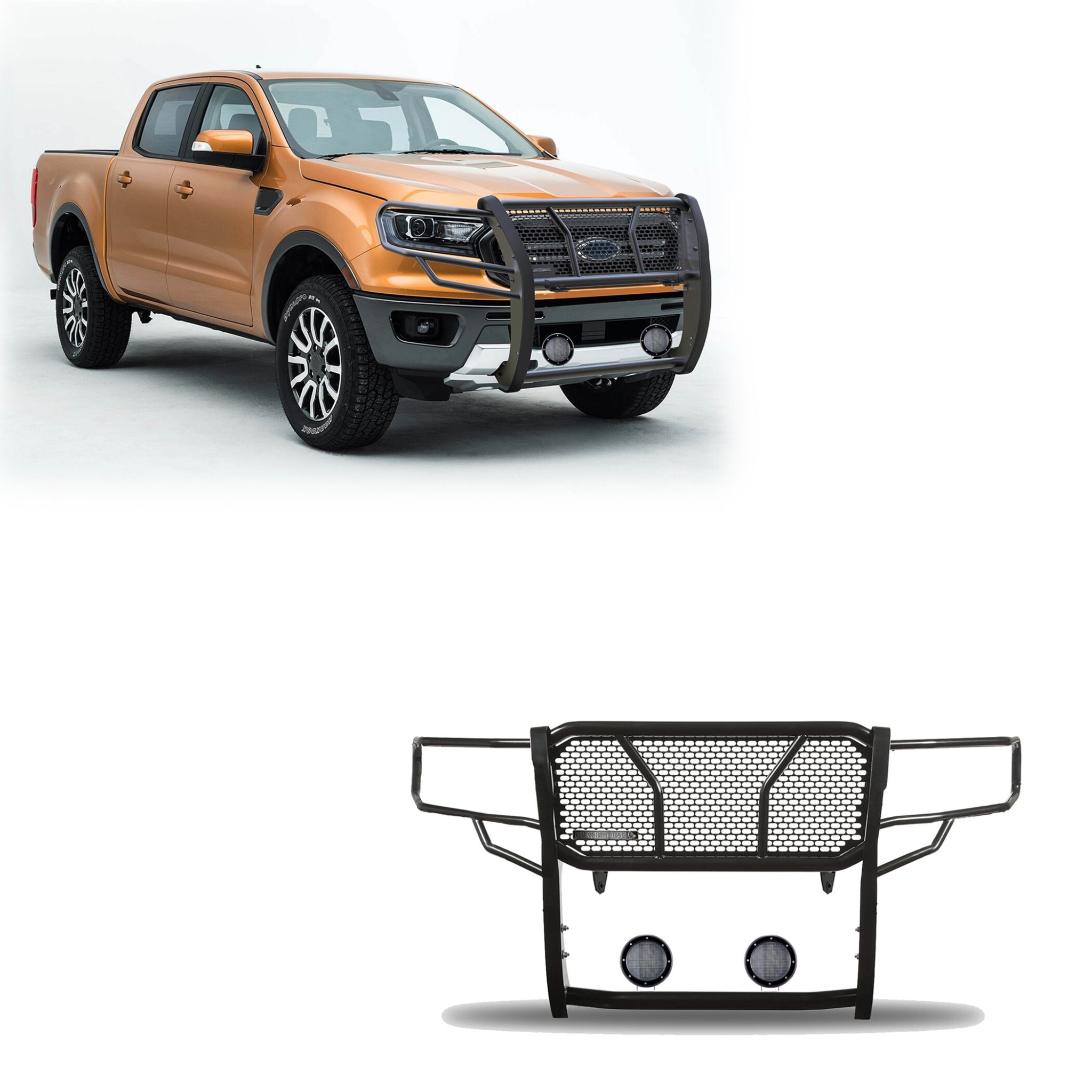 Black Horse Off Road Rugged Heavy Duty Grille Guard Kit Black Steel Modular Pair of 5.3" Dia. LED Flood Lights w/ Black Trim Rings Wiring Harness and Switch It May Interfere with Vehicles equipped with Emergency Braking Systems, Adaptive Cruise Control and Parking Sensors