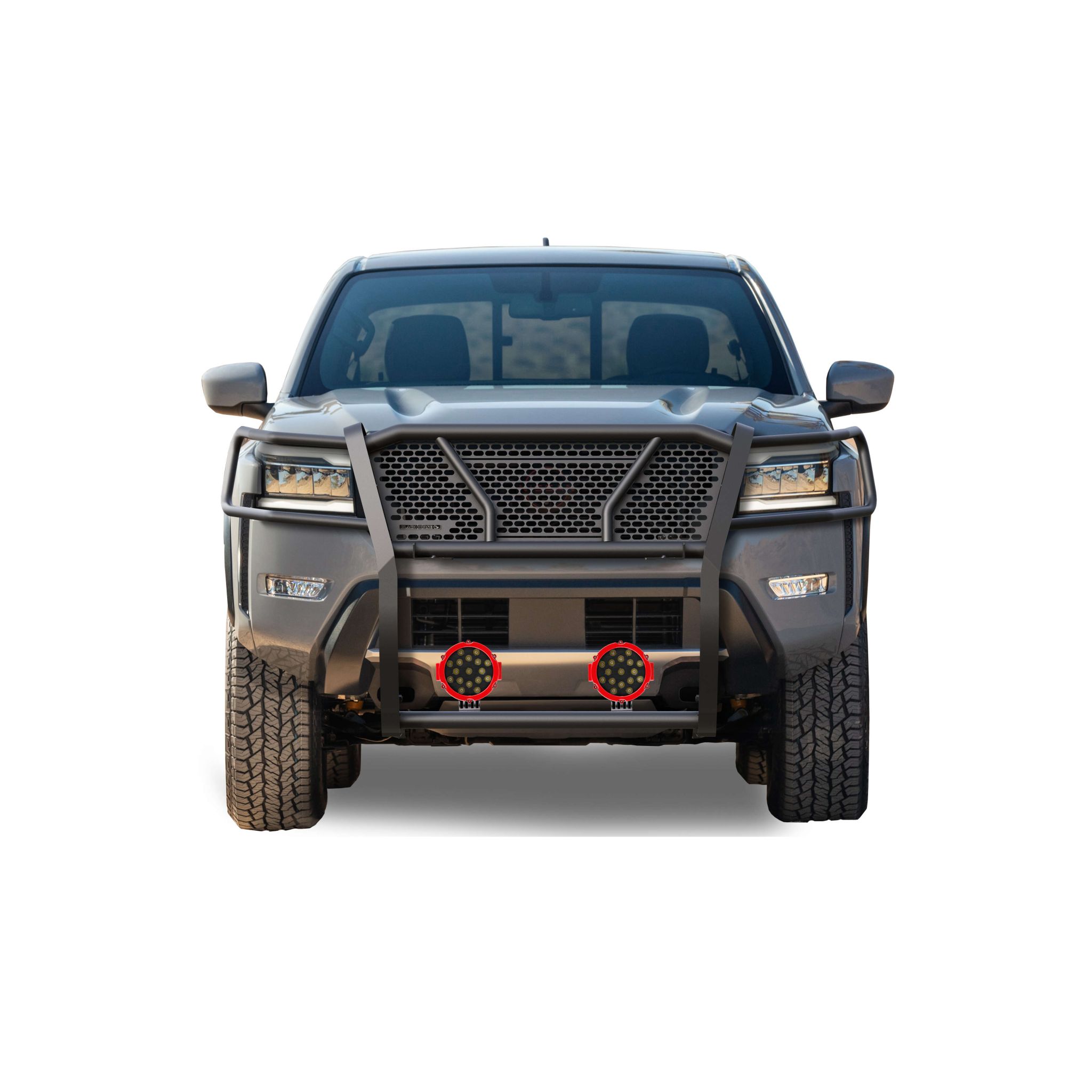 Black Horse Off Road Rugged Heavy Duty Grille Guard Kit Black Steel Modular 2nd Box: 32.30×17.32×11 inches & Incl. pair of 7.0" Dia. LED Lights w/ Red Trim Rings w/ Wiring Harness and Switch It May Interfere with Vehicles equipped with Emergency Braking Systems, Adaptive Cruise Control and Parking Sensors