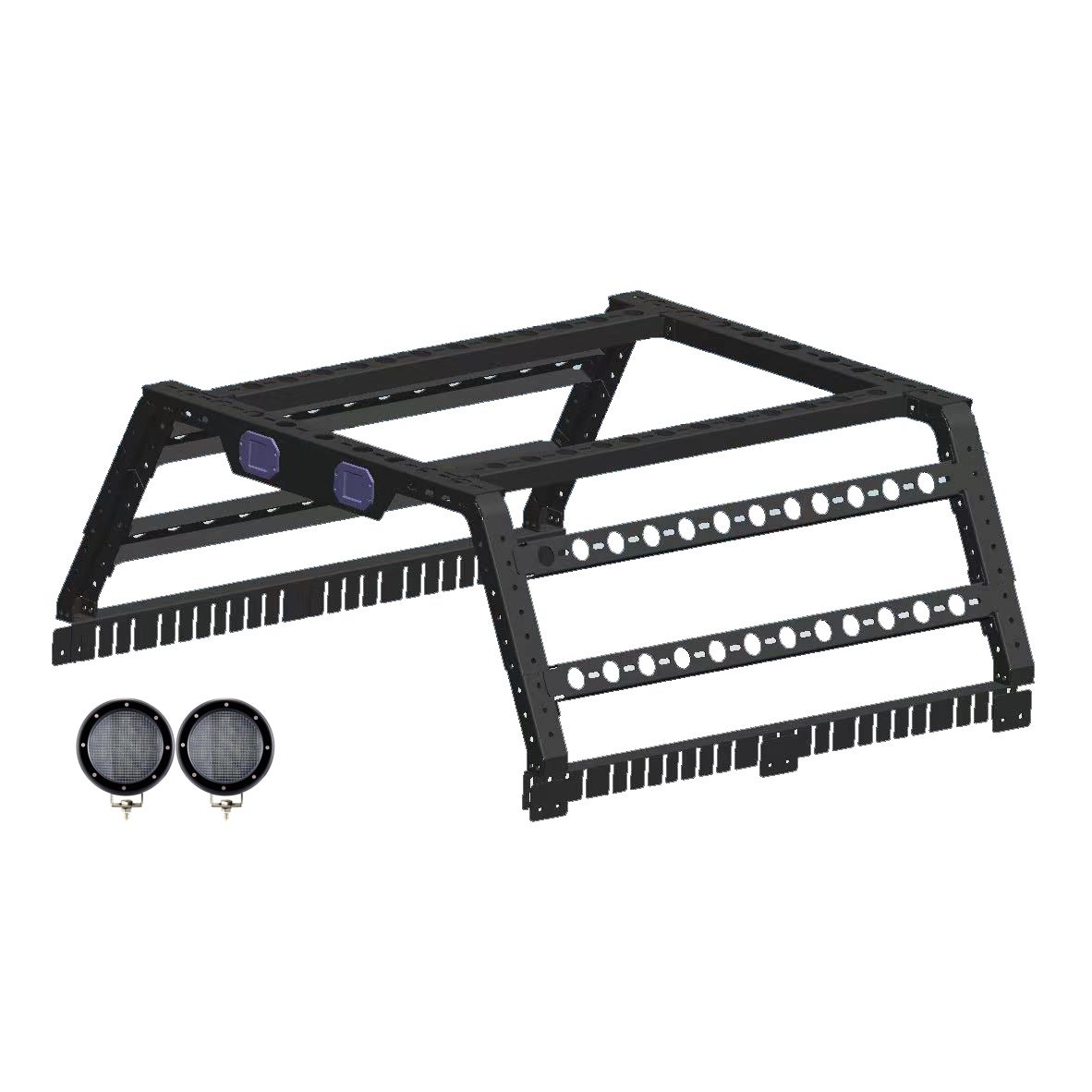 Black Horse Off Road Traveler Overland Utility Bed Rack Kit Black Steel 2nd Box: 57 10 18 inch, 60lbs & 2 sets of 5.3" Dia. Black LED Flood Lights w/ Harness and Switch For Full Size Trucks and Small Trucks Patented